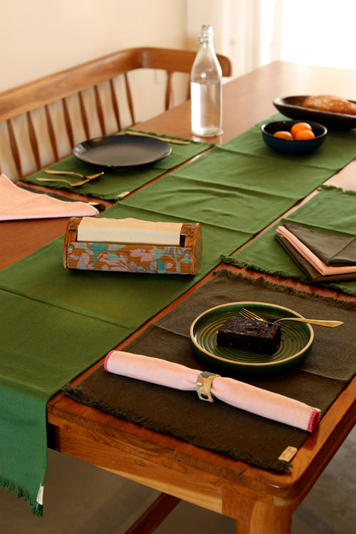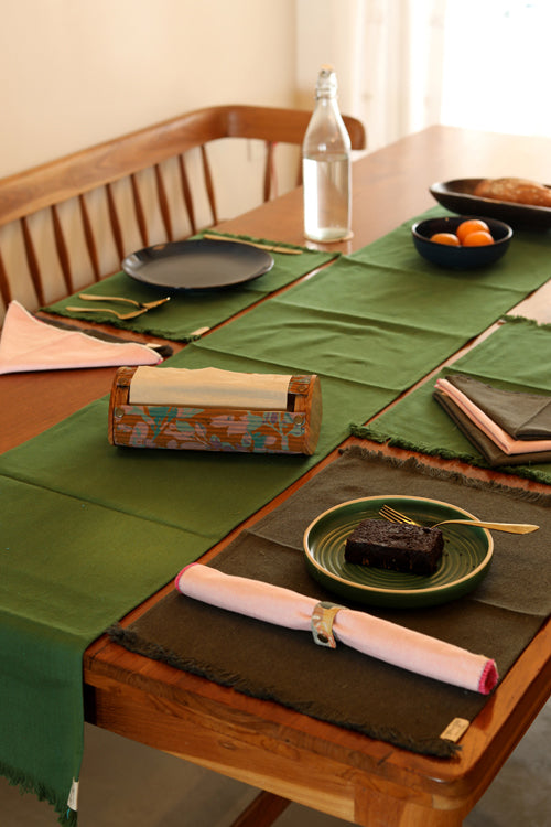 Crafted by Shram Mandir, an organisation supporting individuals affected by leprosy, the set is made from surplus export yarns and shaped through a collaborative design process.
