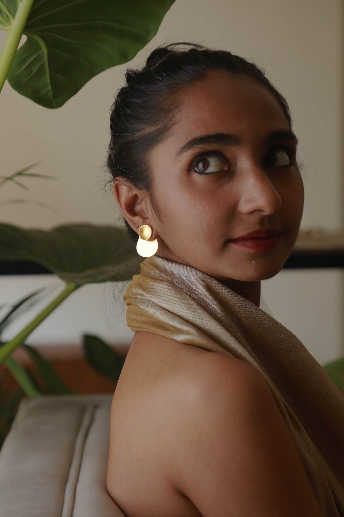 These earrings combine crescent shapes in a layered design that’s both bold and fluid.Styling Tip: Style them with a kaftan dress and metallic flats for a bohemian-inspired look.
