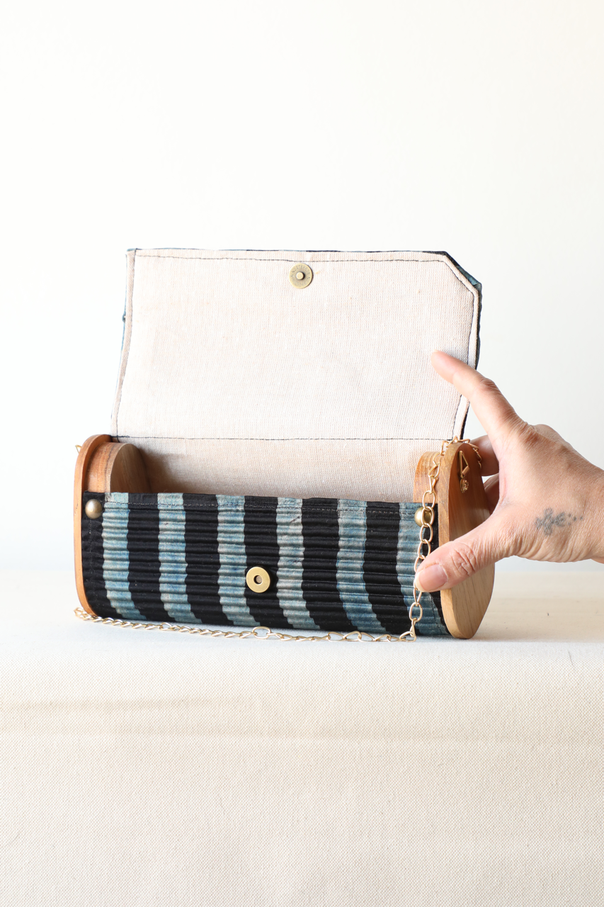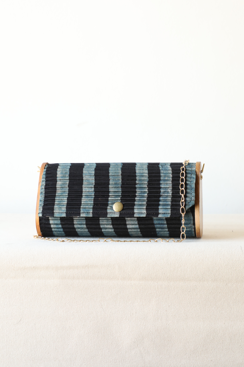 Sustainability: If we used virgin fabric and dyes our carbon footprint and water usage would be off the charts. Instead, our circular production uses upcycled Fabrics sourced directly from Block printer, and post production waste by local Tailors and Designers.. The classic mini-clutch now comes in three distinct shapes, crafted entirely from upcycled silk. Perfectly designed for those who value simplicity, this rigid mini-clutch is not only vegan but also eco-friendly, made from materials like upcycled fabric and reclaimed wood. It comes with a sling chain and is ideal for storing essentials such as your phone, mini cardholder, car keys, and basic makeup