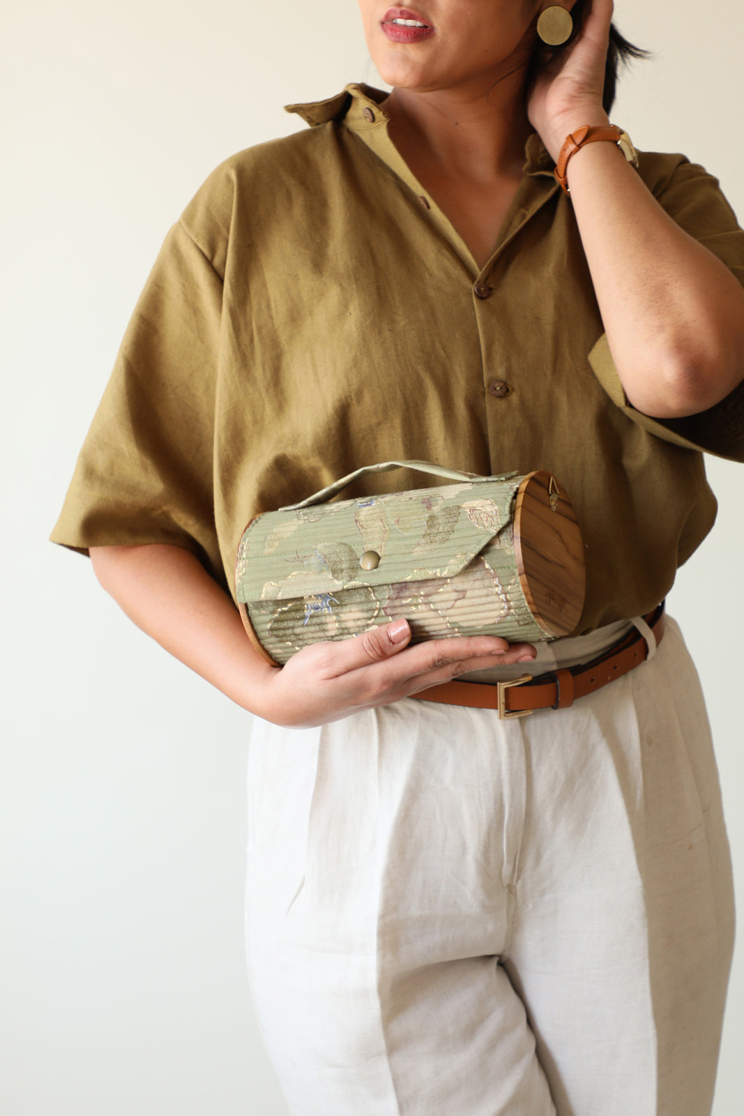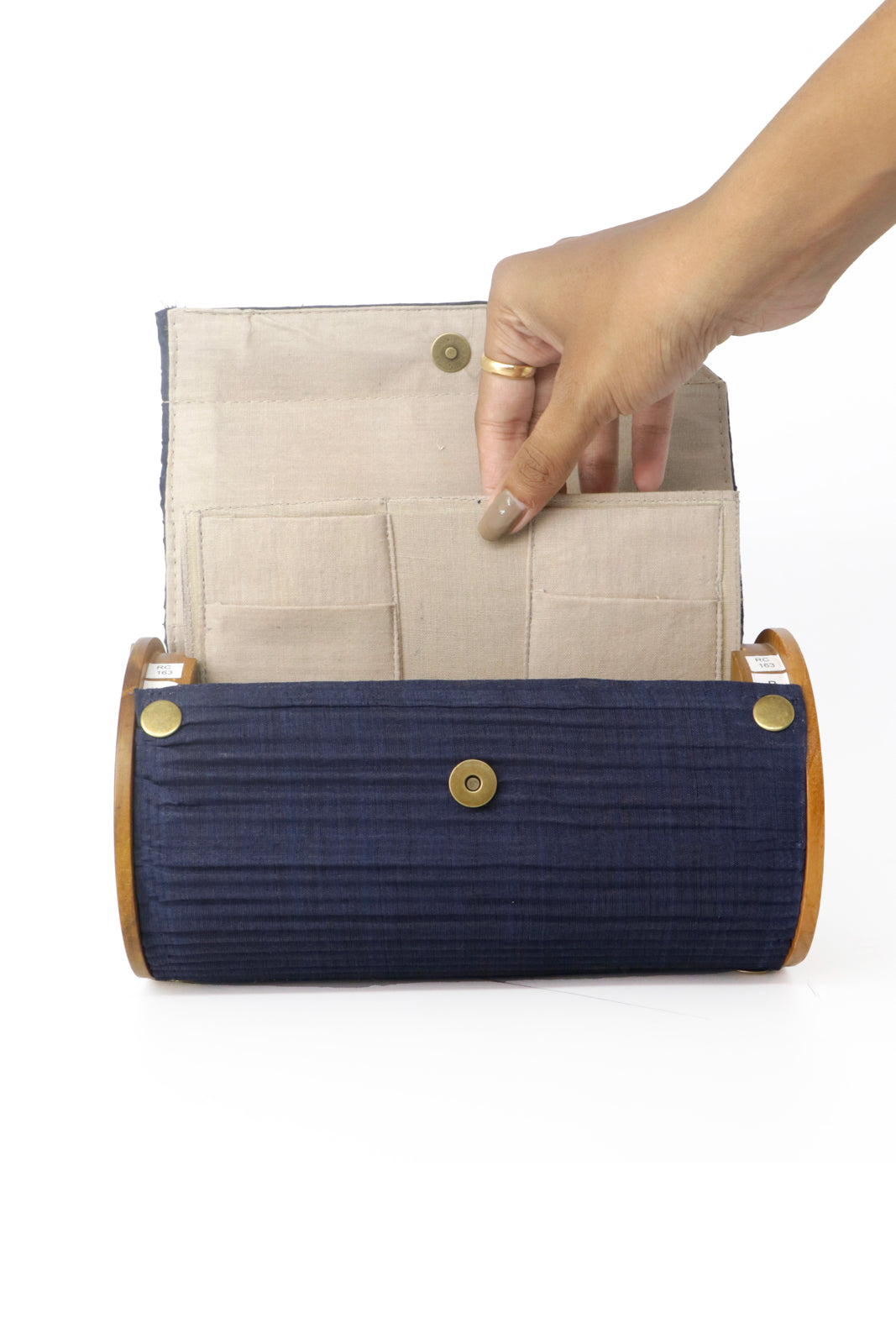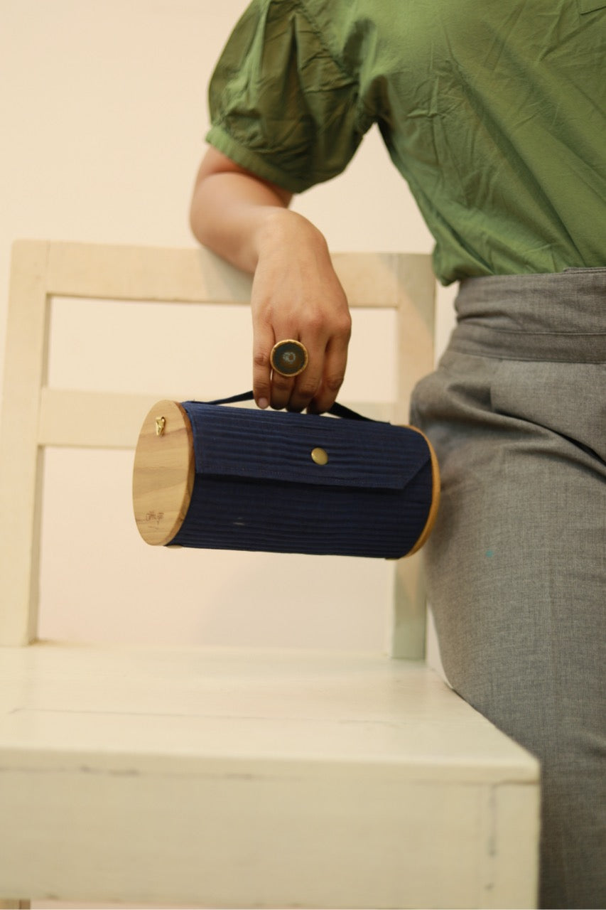 Lukka Chuppi Round Clutch – compact yet spacious enough to accommodate all your essentials. This two-in-one bag comes with two sleeves, one pair of wood, a sleek belt, and a divider to enhance organizational efficiency.