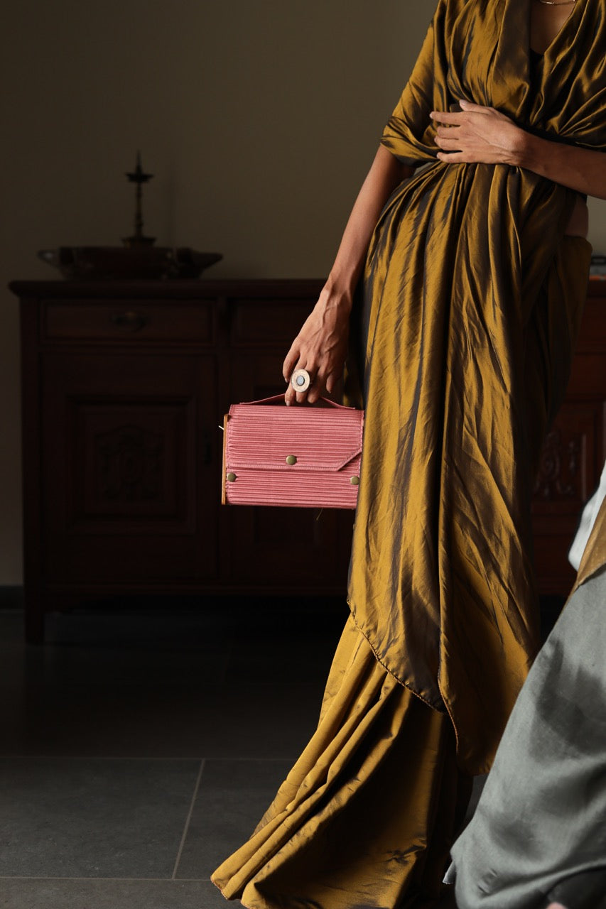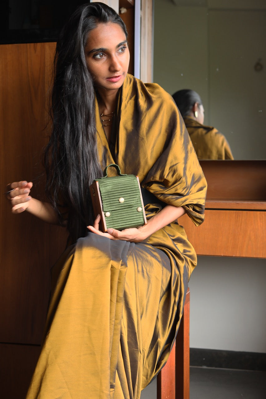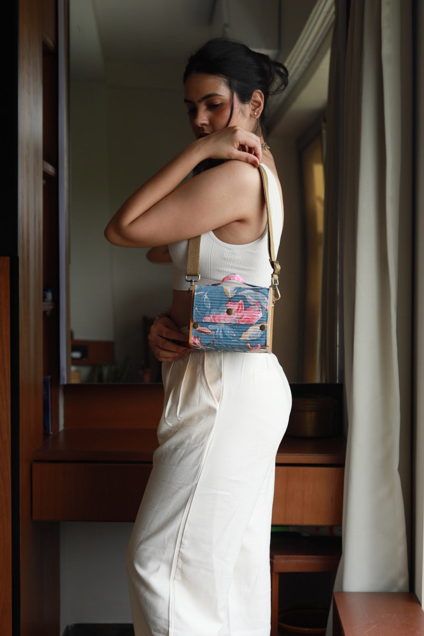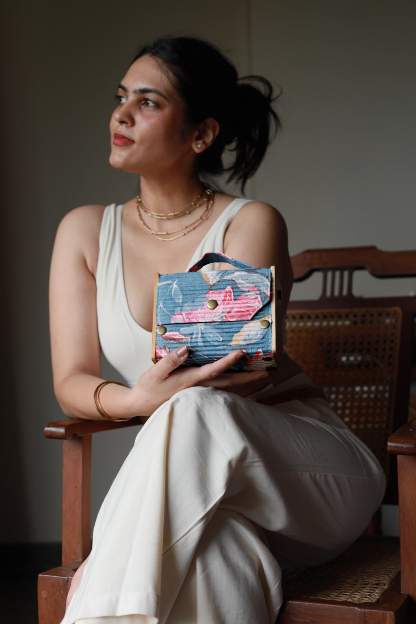 Sustainability: If we used virgin fabric and dyes our carbon footprint and water usage would be off the charts. Instead, our circular production uses upcycled Fabrics sourced directly from Block printer, and post production waste by local Tailors and Designers.. The Lukka Chuppi Box Clutch Embodies The Perfect Blend Of Elegance, And Sustainability While Showcasing An Irresistibly Minimalistic Style. We Believe In The Power Of Up-Cycling And Hand-Craftsmanship To Create Beautiful, Sustainable Bags That Not Only Make A Fashion Statement But Also Contribute To A Better Planet. Our 4-in-1 Clutch Box includes one pair of wood and four sleeves, allowing you to effortlessly create four different clutches, each in a unique size, one at a time. It also comes with two differently colored belts for added style. Our products are not only collapsible but also interchangeable and entirely foldable. Packaged in zero-waste packaging, they are crafted with eco-friendly materials such as upcycled fabric and reclaimed wood.