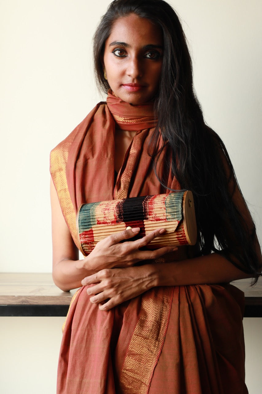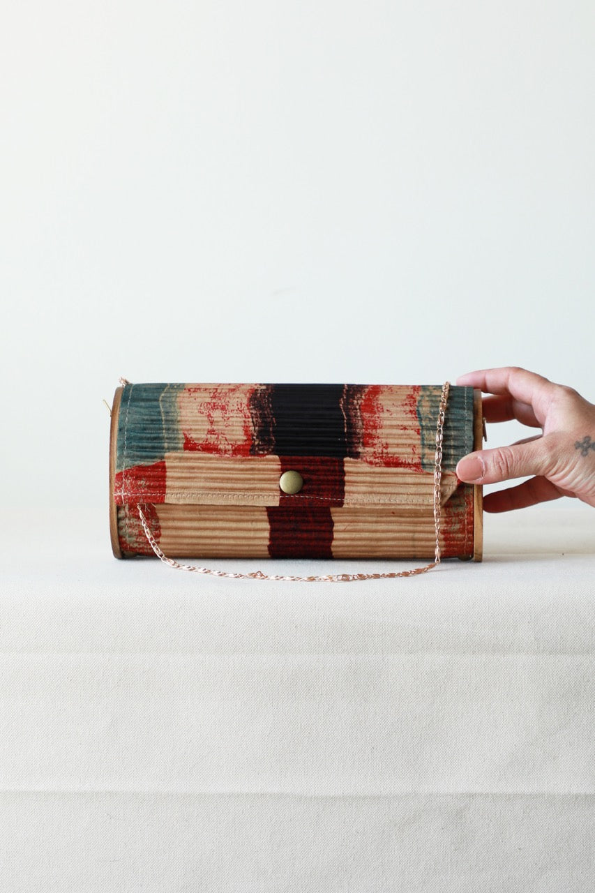 Sustainability: If we used virgin fabric and dyes our carbon footprint and water usage would be off the charts. Instead, our circular production uses upcycled Fabrics sourced directly from Block printer, and post production waste by local Tailors and Designers.. The classic mini-clutch now comes in three distinct shapes, crafted entirely from upcycled silk. Perfectly designed for those who value simplicity, this rigid mini-clutch is not only vegan but also eco-friendly, made from materials like upcycled fabric and reclaimed wood. It comes with a sling chain and is ideal for storing essentials such as your phone, mini cardholder, car keys, and basic makeup