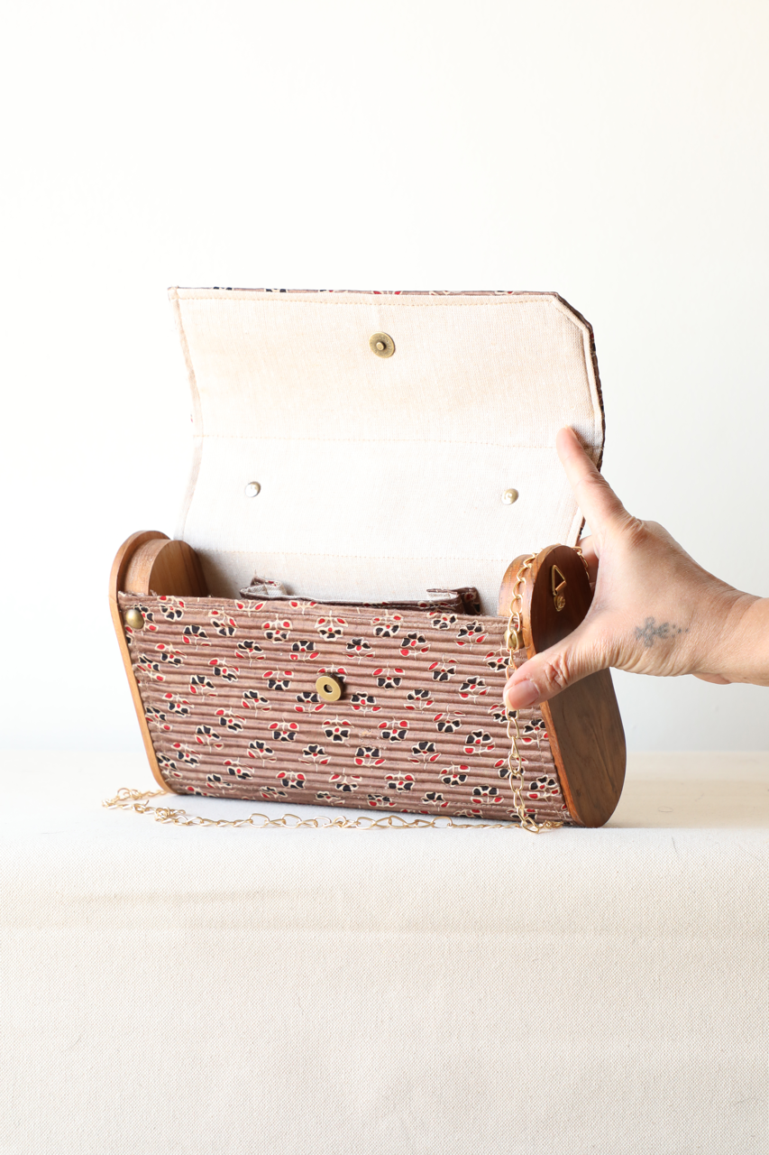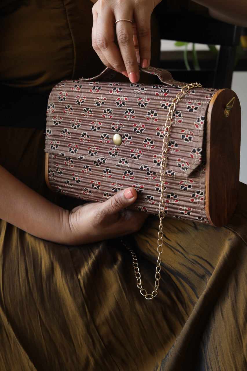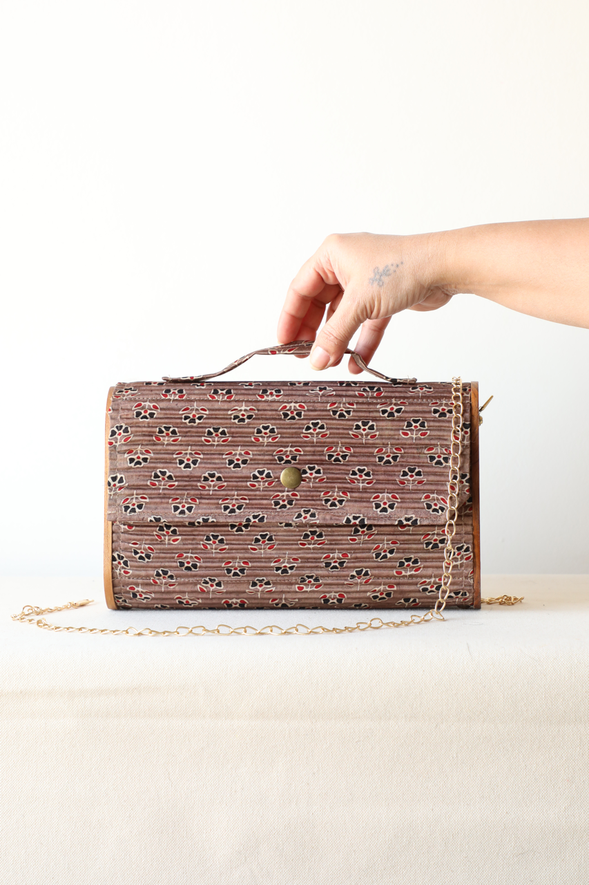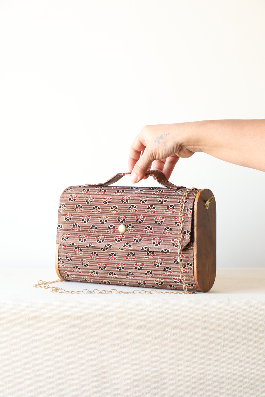 Sustainability: If we used virgin fabric and dyes our carbon footprint and water usage would be off the charts. Instead, our circular production uses upcycled Fabrics sourced directly from Block printer, and post production waste by local Tailors and Designers.. Our classic box clutch now comes in a new shape—the capsule clutch. Made with 100% eco-friendly materials like upcycled fabric and reclaimed wood, it provides ample space inside for your phone, cardholder, small makeup items, and wallet. It includes a sling chain for a chic look and is packed in zero-waste packaging, making it a smart choice for eco-minded shopper.