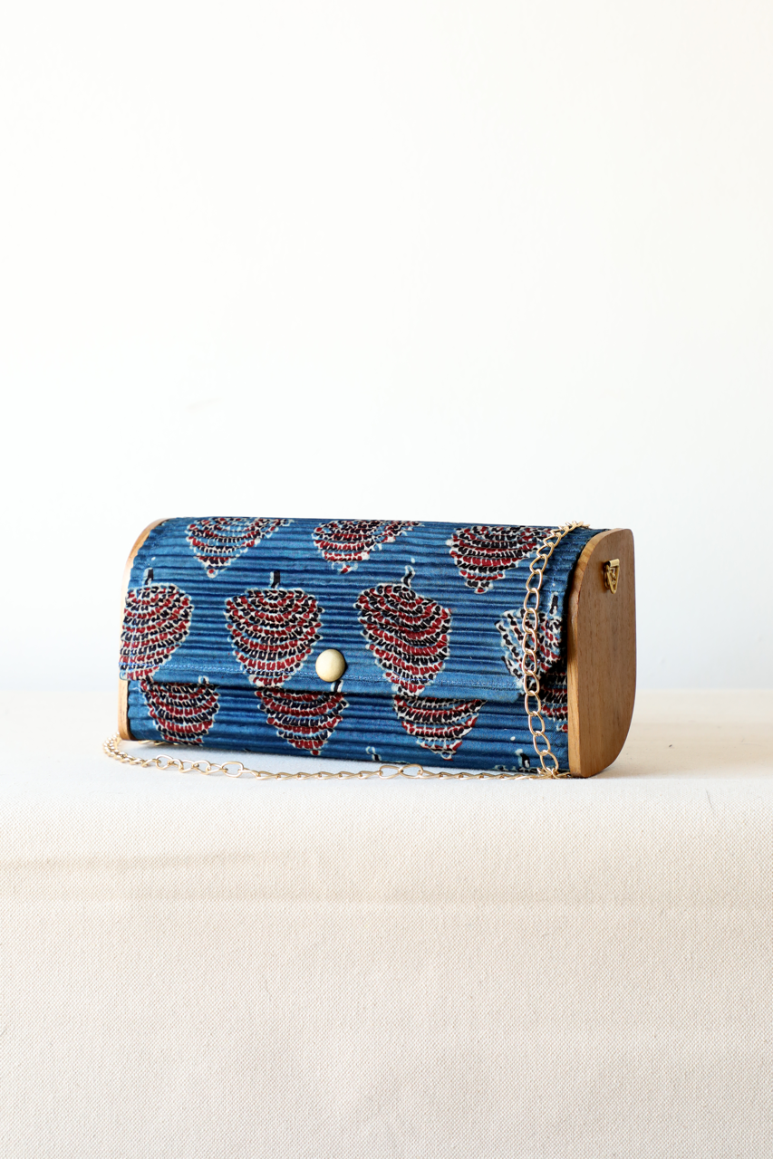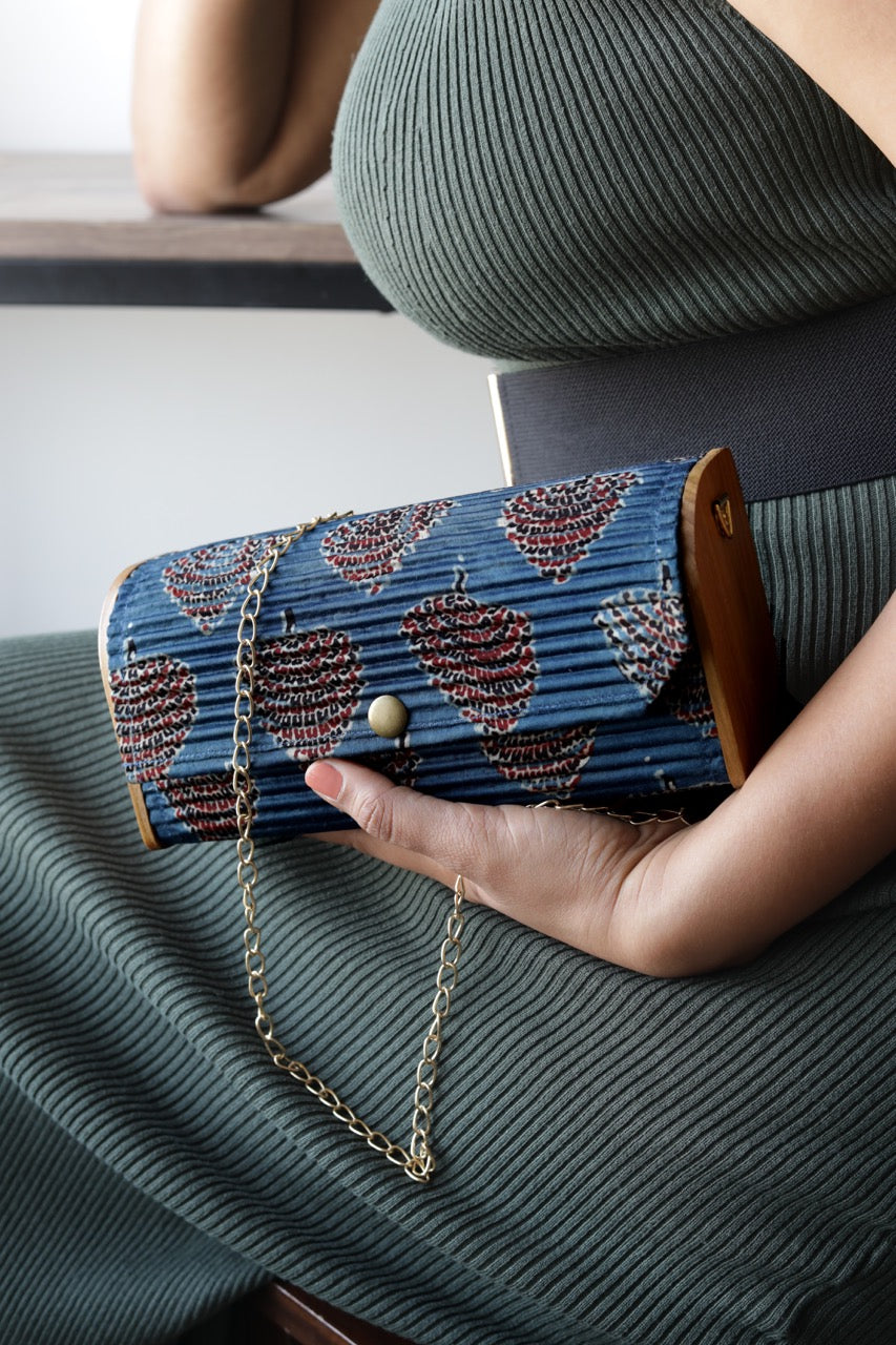 Sustainability: If we used virgin fabric and dyes our carbon footprint and water usage would be off the charts. Instead, our circular production uses upcycled Fabrics sourced directly from Block printer, and post production waste by local Tailors and Designers.. The classic mini-clutch now comes in three distinct shapes, crafted entirely from upcycled silk. Perfectly designed for those who value simplicity, this rigid mini-clutch is not only vegan but also eco-friendly, made from materials like upcycled fabric and reclaimed wood. It comes with a sling chain and is ideal for storing essentials such as your phone, mini cardholder, car keys, and basic makeup
