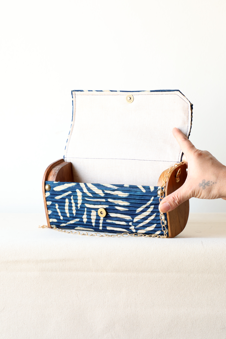 Sustainability: If we used virgin fabric and dyes our carbon footprint and water usage would be off the charts. Instead, our circular production uses upcycled Fabrics sourced directly from Block printer, and post production waste by local Tailors and Designers.. The classic mini-clutch now comes in three distinct shapes, crafted entirely from upcycled silk. Perfectly designed for those who value simplicity, this rigid mini-clutch is not only vegan but also eco-friendly, made from materials like upcycled fabric and reclaimed wood. It comes with a sling chain and is ideal for storing essentials such as your phone, mini cardholder, car keys, and basic makeup