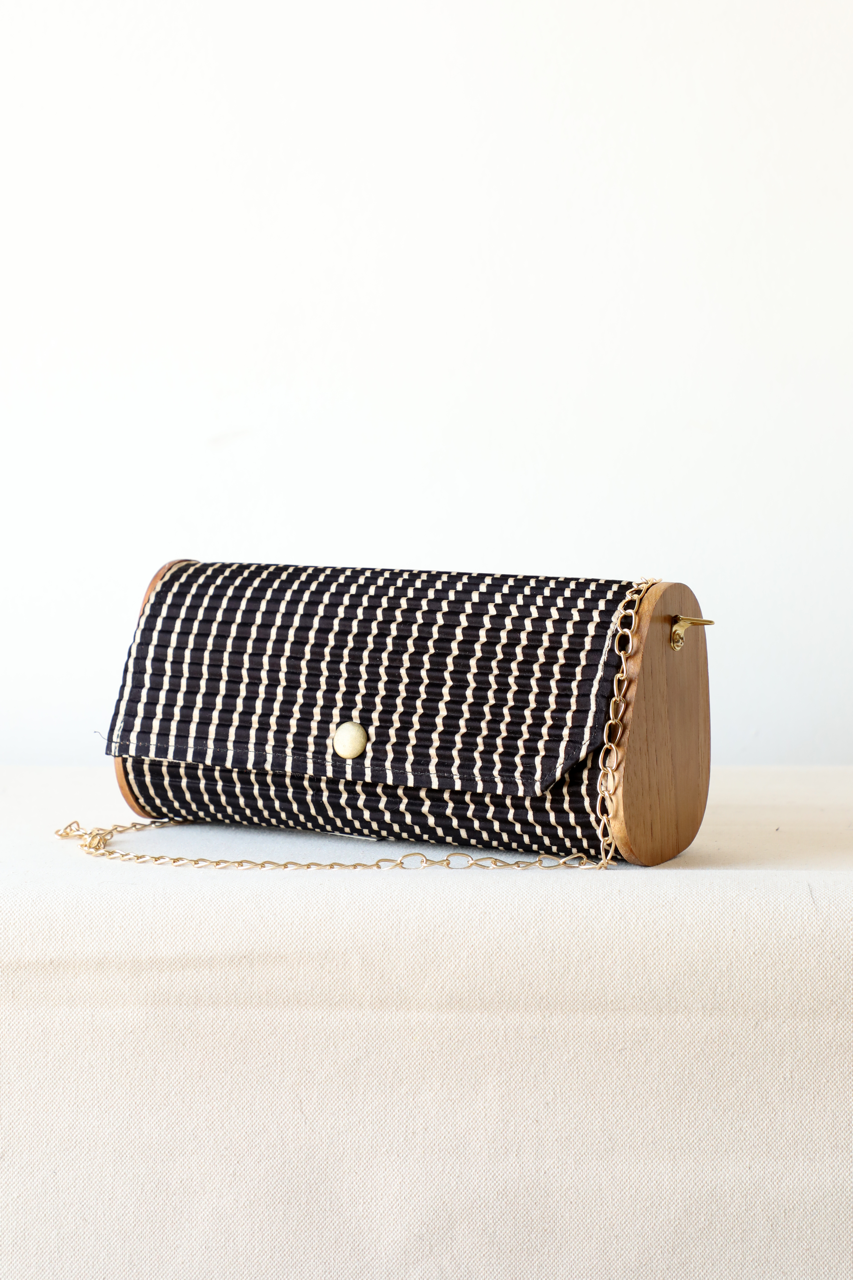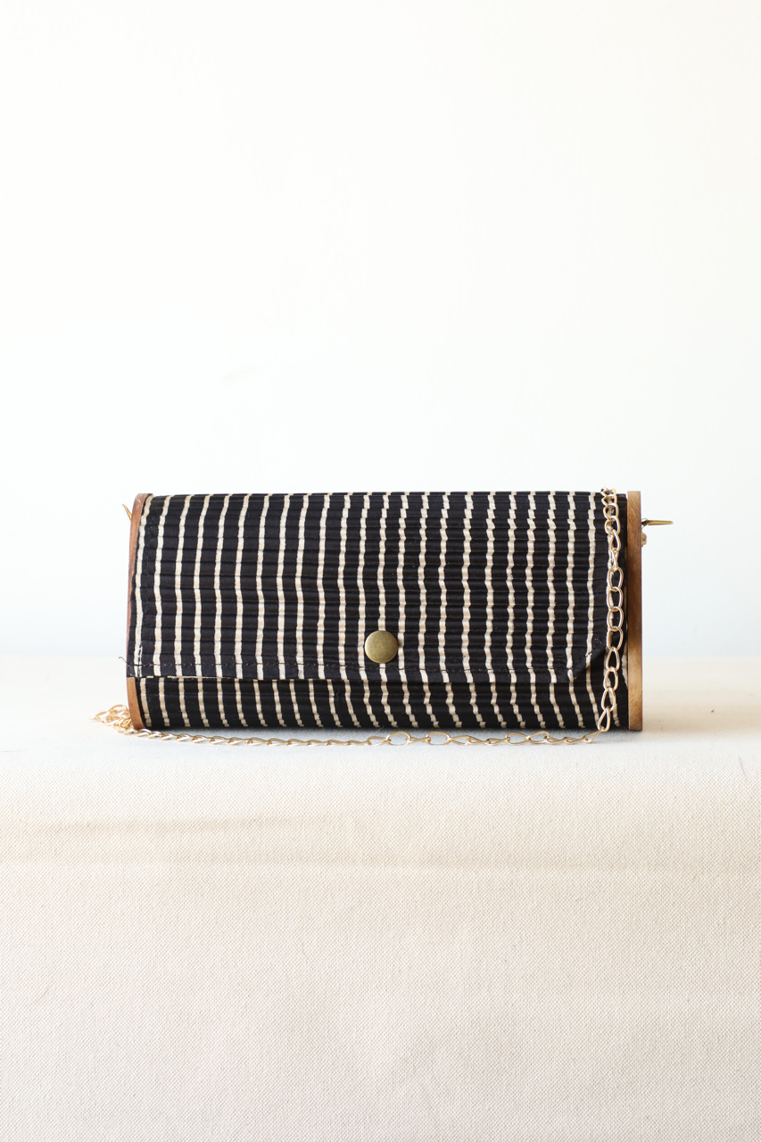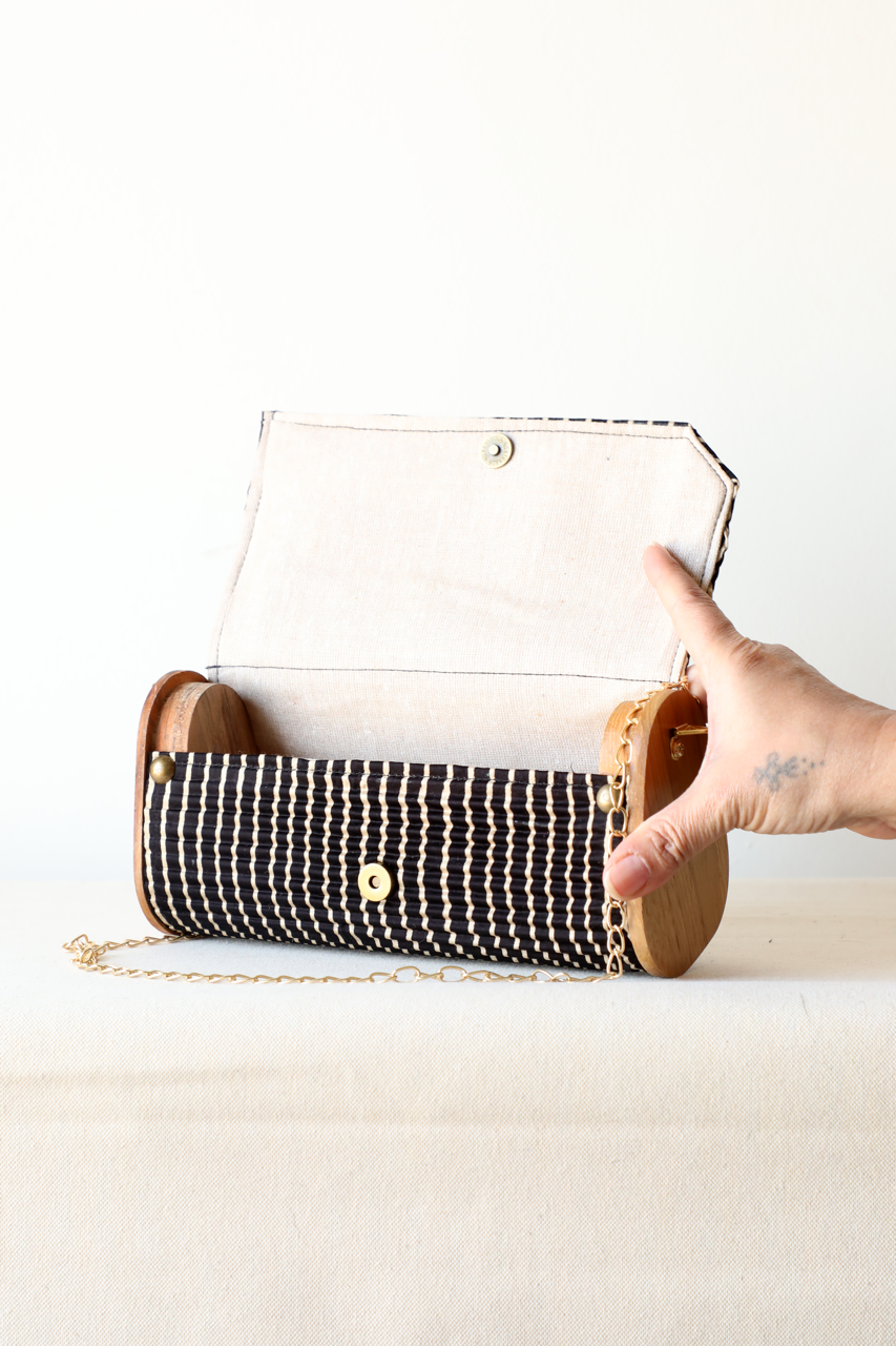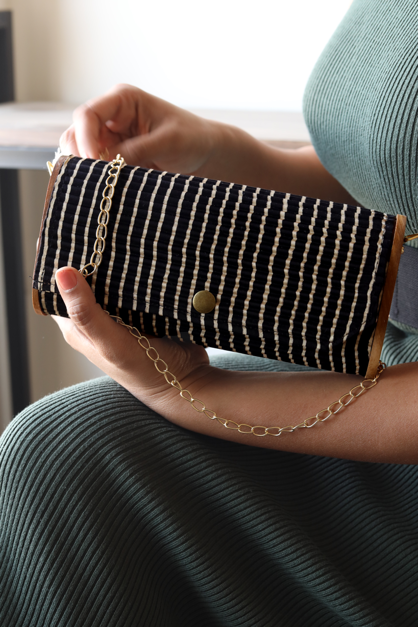 Sustainability: If we used virgin fabric and dyes our carbon footprint and water usage would be off the charts. Instead, our circular production uses upcycled Fabrics sourced directly from Block printer, and post production waste by local Tailors and Designers.. The classic mini-clutch now comes in three distinct shapes, crafted entirely from upcycled silk. Perfectly designed for those who value simplicity, this rigid mini-clutch is not only vegan but also eco-friendly, made from materials like upcycled fabric and reclaimed wood. It comes with a sling chain and is ideal for storing essentials such as your phone, mini cardholder, car keys, and basic makeup