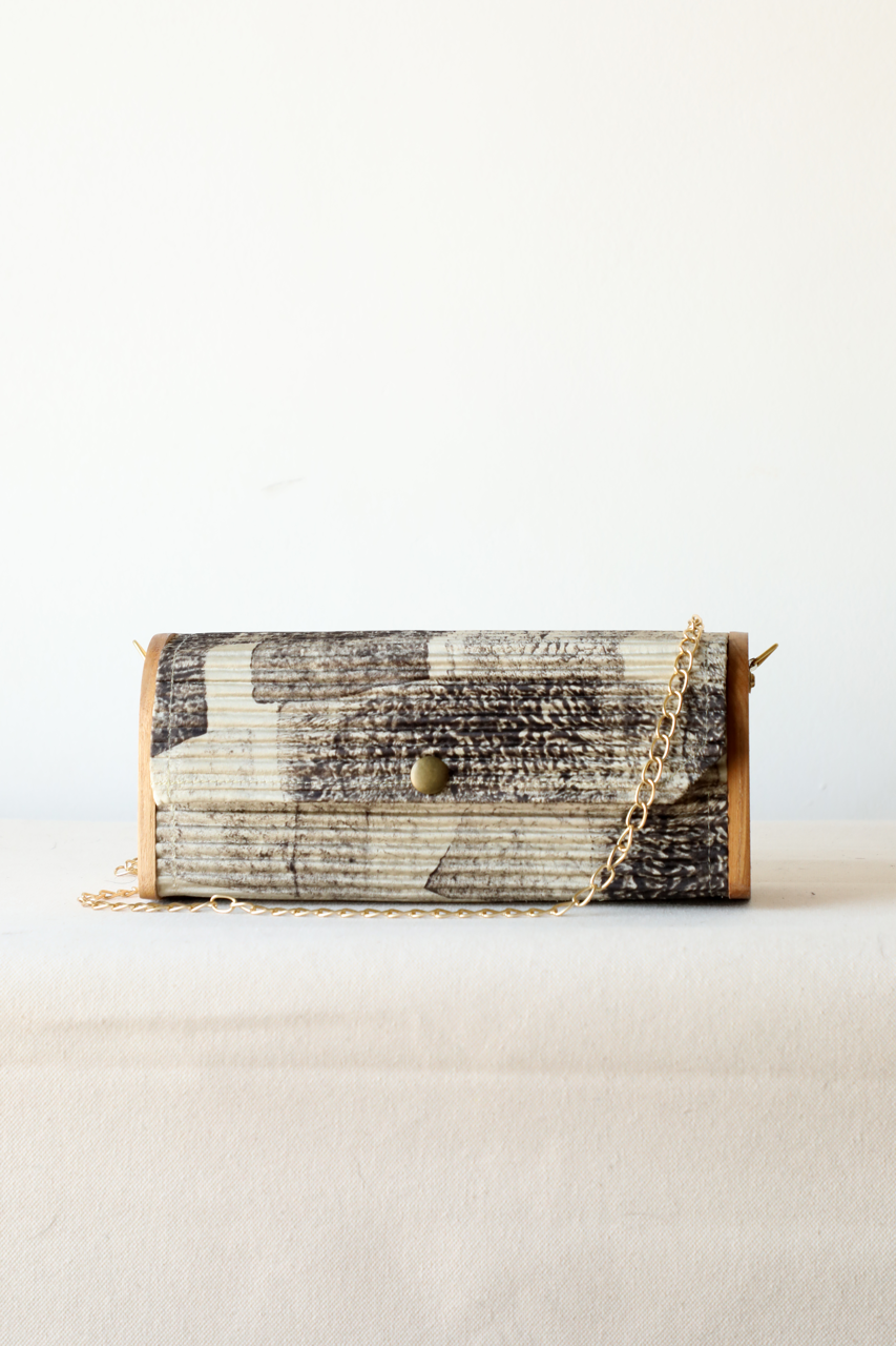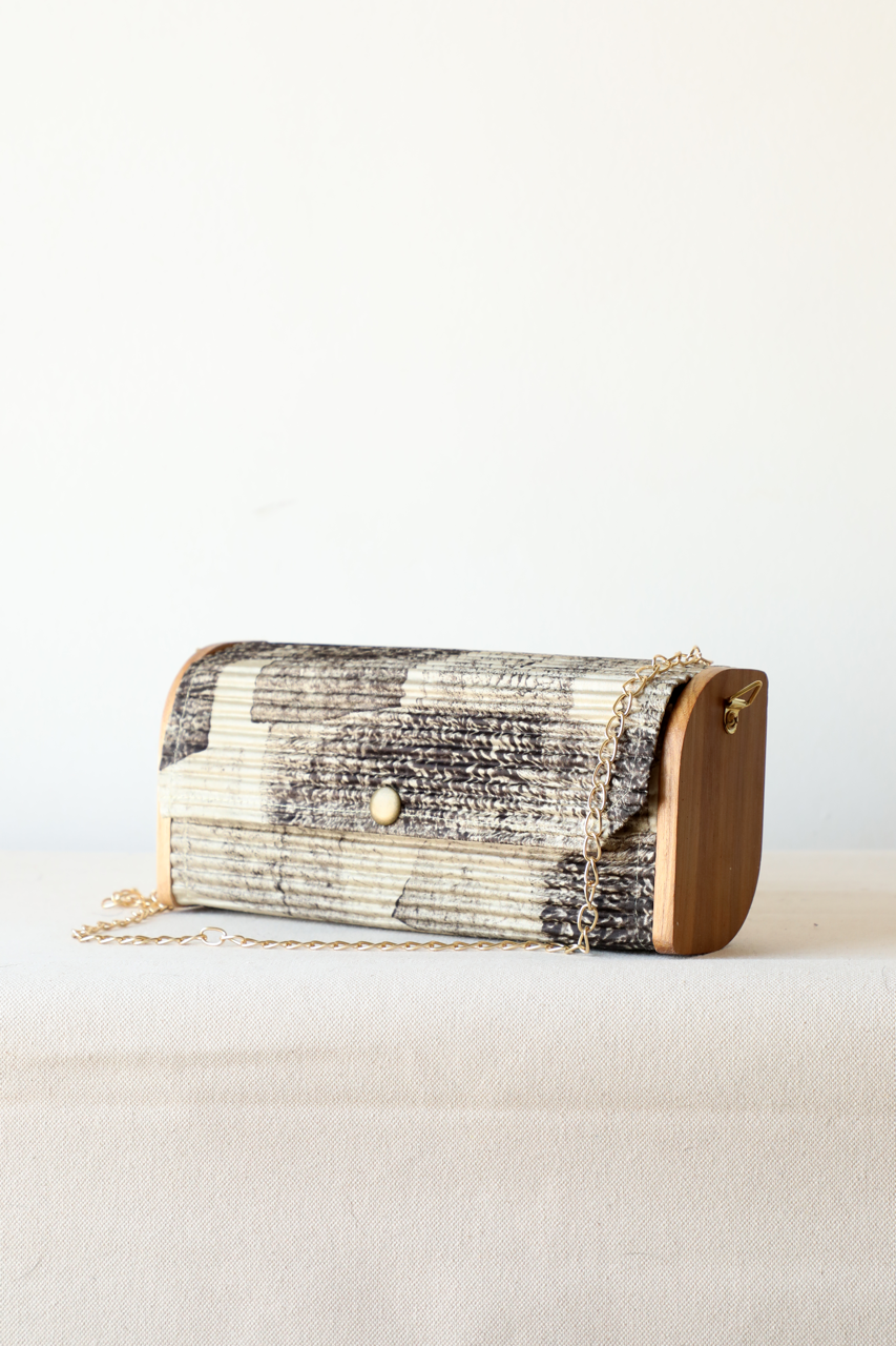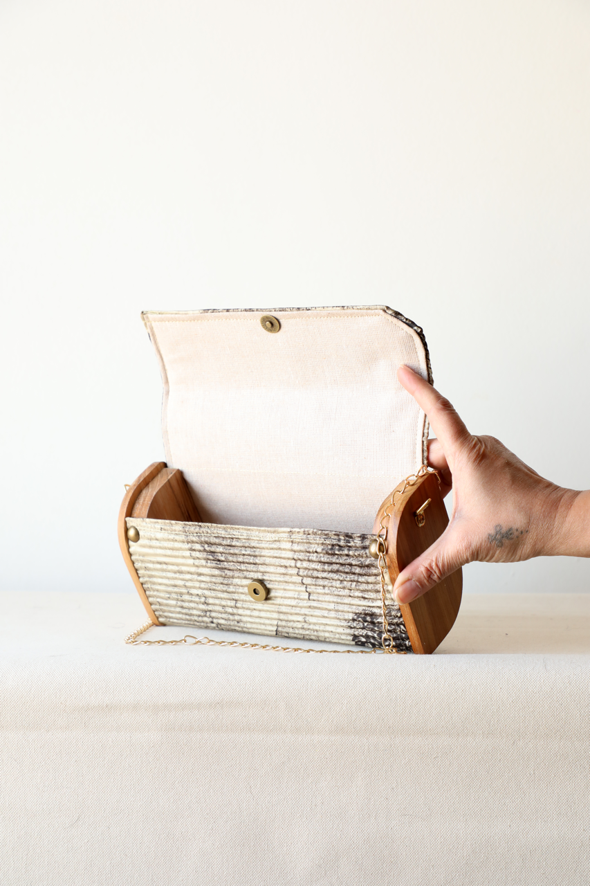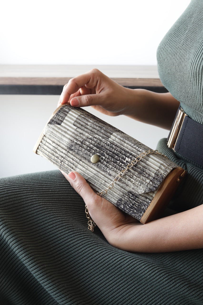 Sustainability: If we used virgin fabric and dyes our carbon footprint and water usage would be off the charts. Instead, our circular production uses upcycled Fabrics sourced directly from Block printer, and post production waste by local Tailors and Designers.. The classic mini-clutch now comes in three distinct shapes, crafted entirely from upcycled silk. Perfectly designed for those who value simplicity, this rigid mini-clutch is not only vegan but also eco-friendly, made from materials like upcycled fabric and reclaimed wood. It comes with a sling chain and is ideal for storing essentials such as your phone, mini cardholder, car keys, and basic makeup