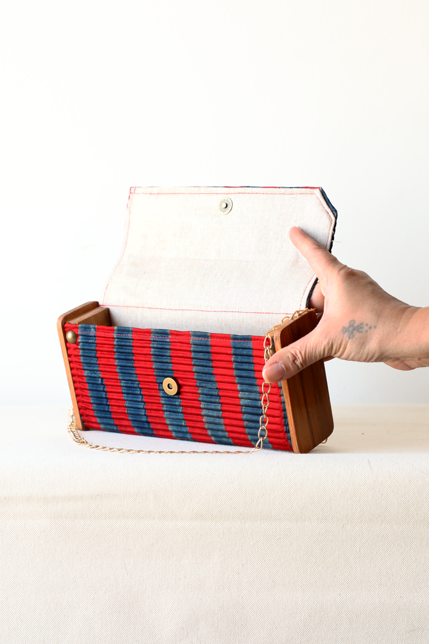 Sustainability: If we used virgin fabric and dyes our carbon footprint and water usage would be off the charts. Instead, our circular production uses upcycled Fabrics sourced directly from Block printer, and post production waste by local Tailors and Designers.. The classic mini-clutch now comes in three distinct shapes, crafted entirely from upcycled silk. Perfectly designed for those who value simplicity, this rigid mini-clutch is not only vegan but also eco-friendly, made from materials like upcycled fabric and reclaimed wood. It comes with a sling chain and is ideal for storing essentials such as your phone, mini cardholder, car keys, and basic makeup