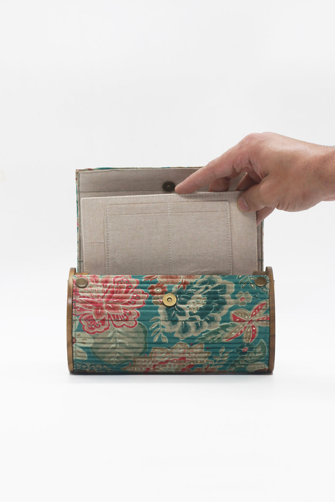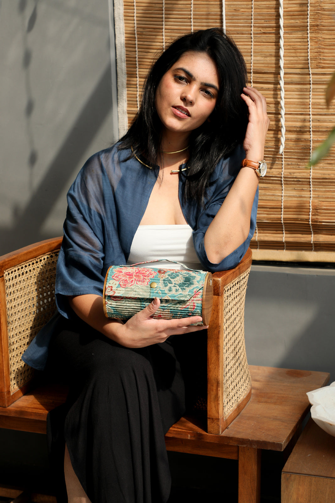 Lukka Chuppi Round Clutch – compact yet spacious enough to accommodate all your essentials. This two-in-one bag comes with two sleeves, one pair of wood, a sleek belt, and a divider to enhance organizational efficiency.
