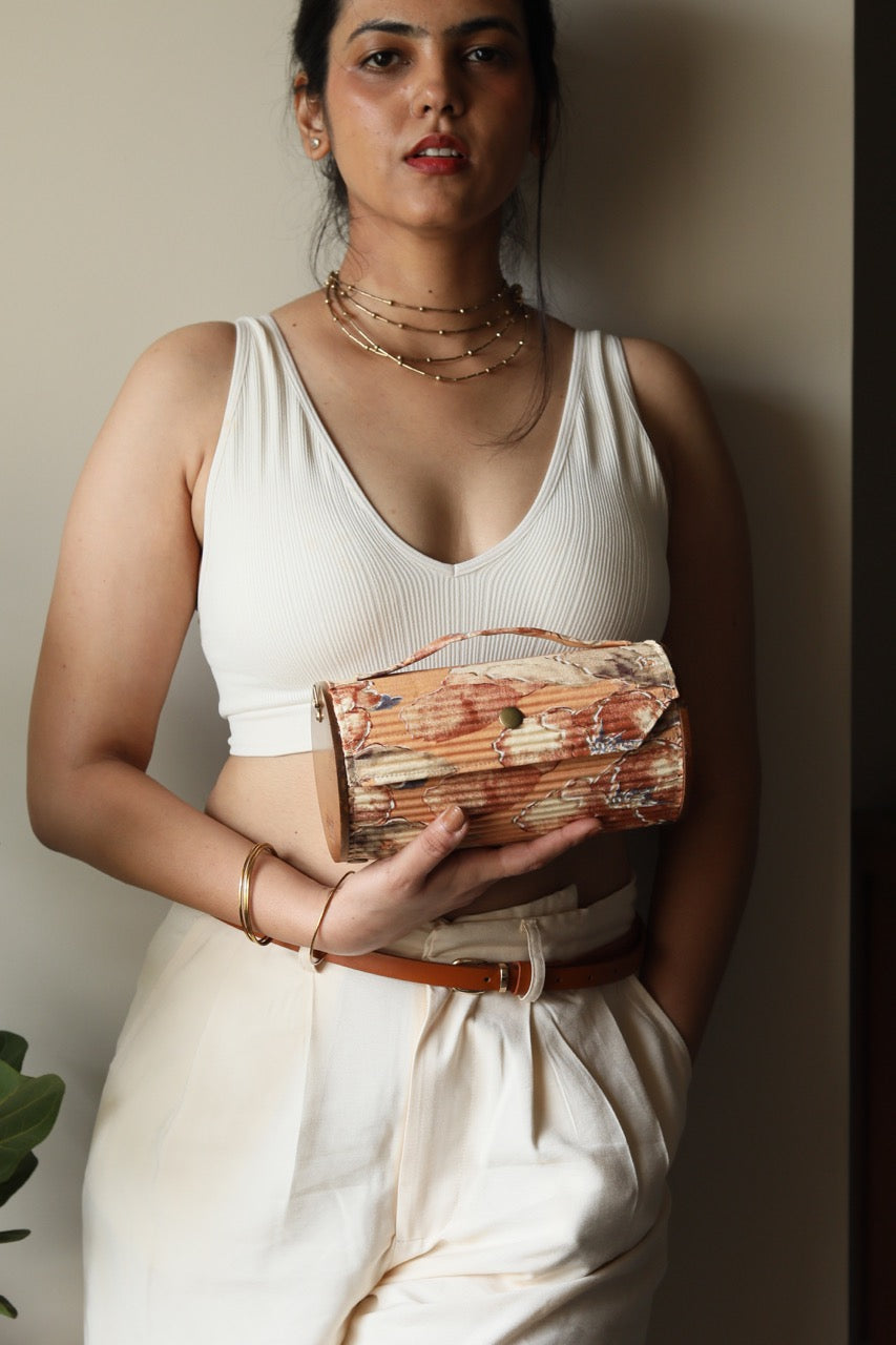 Sustainability: If we used virgin fabric and dyes our carbon footprint and water usage would be off the charts. Instead, our circular production uses upcycled Fabrics sourced directly from Block printer, and post production waste by local Tailors and Designers.. Lukka Chuppi Round Clutch – compact yet spacious enough to accommodate all your essentials. This two-in-one bag comes with two sleeves, one pair of wood, a sleek belt, and a divider to enhance organizational efficiency.