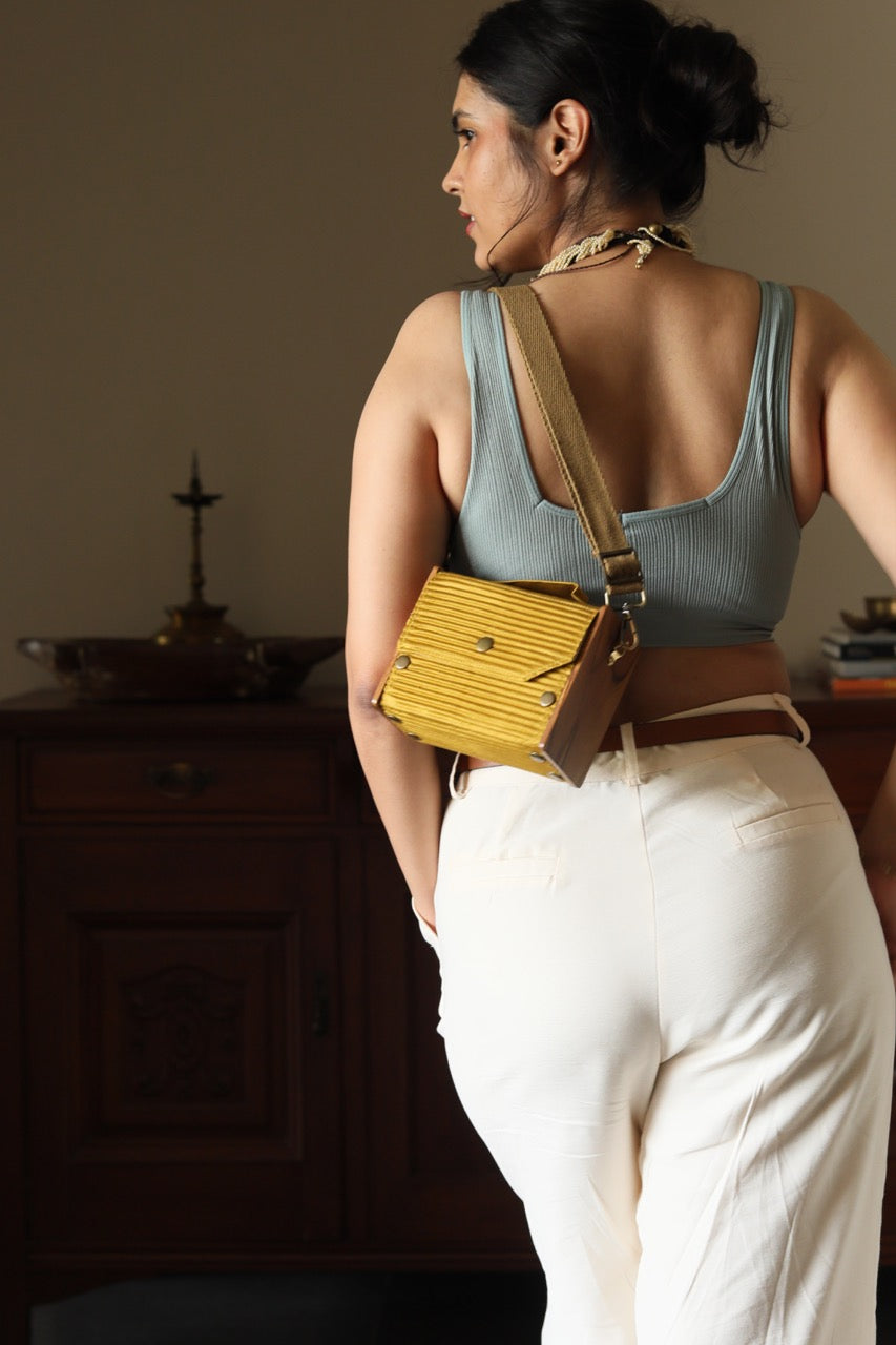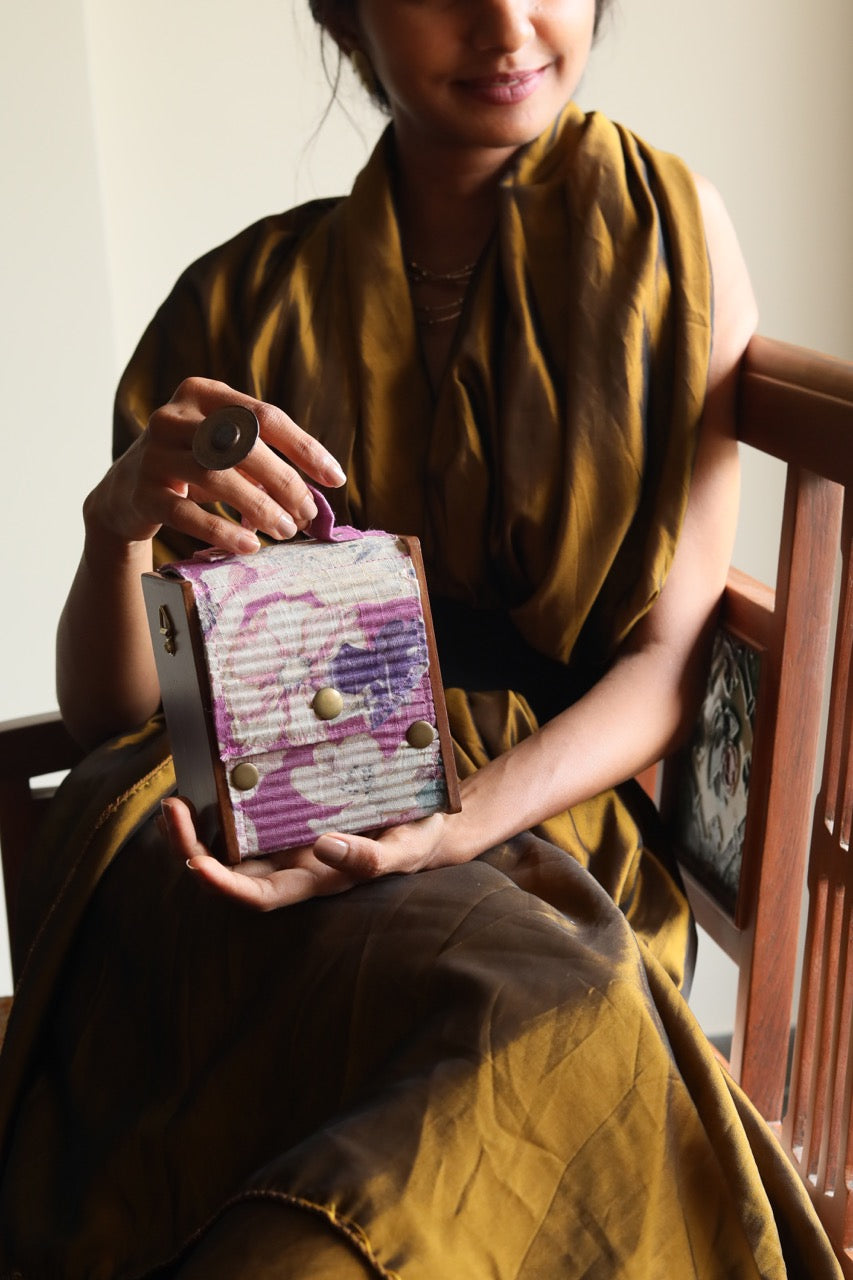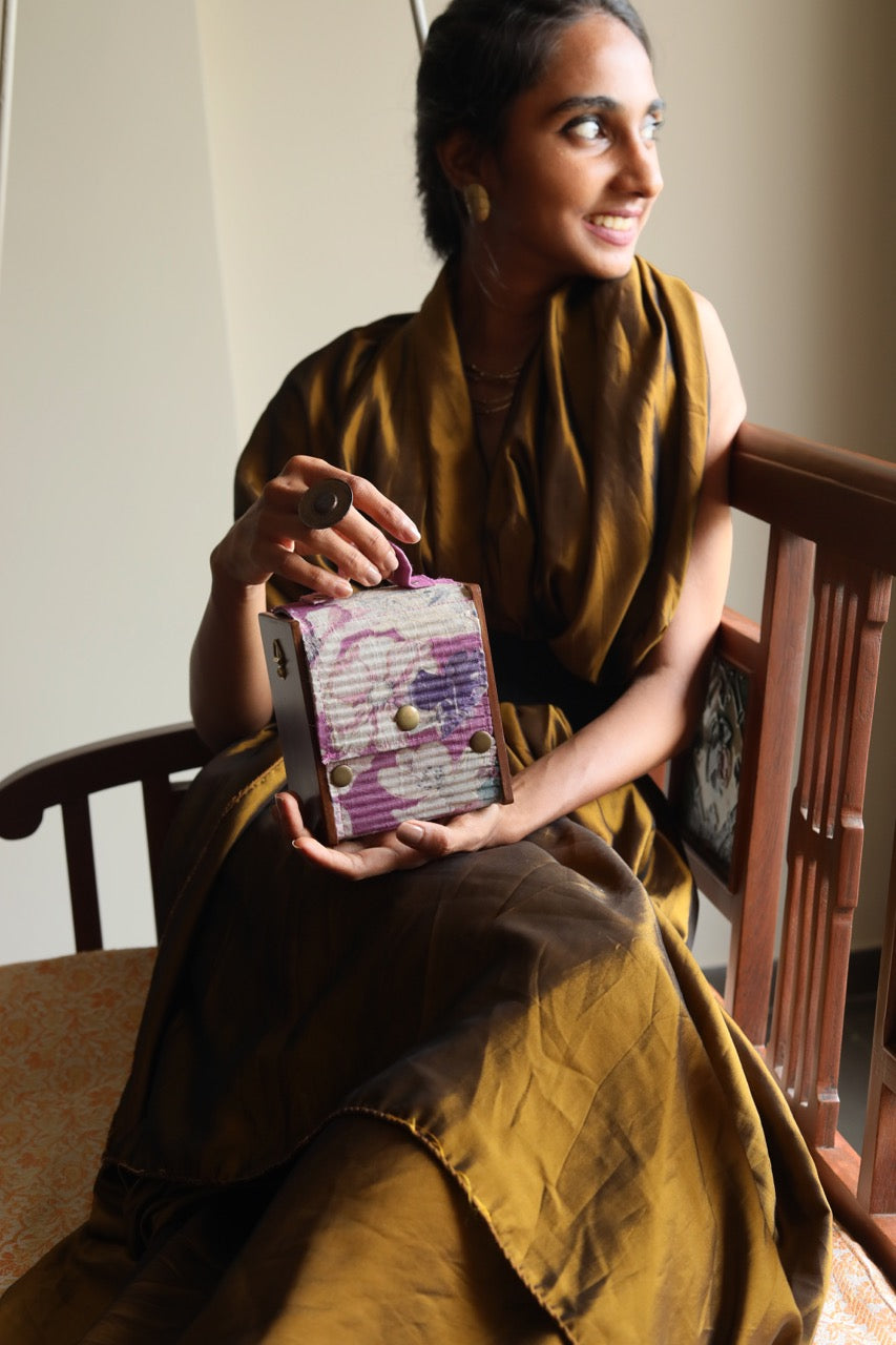 Sustainability: If we used virgin fabric and dyes our carbon footprint and water usage would be off the charts. Instead, our circular production uses upcycled Fabrics sourced directly from Block printer, and post production waste by local Tailors and Designers.. The Lukka Chuppi Box Clutch Embodies The Perfect Blend Of Elegance, And Sustainability While Showcasing An Irresistibly Minimalistic Style. We Believe In The Power Of Up-Cycling And Hand-Craftsmanship To Create Beautiful, Sustainable Bags That Not Only Make A Fashion Statement But Also Contribute To A Better Planet. Our 4-in-1 Clutch Box includes one pair of wood and four sleeves, allowing you to effortlessly create four different clutches, each in a unique size, one at a time. It also comes with two differently colored belts for added style. Our products are not only collapsible but also interchangeable and entirely foldable. Packaged in zero-waste packaging, they are crafted with eco-friendly materials such as upcycled fabric and reclaimed wood.
