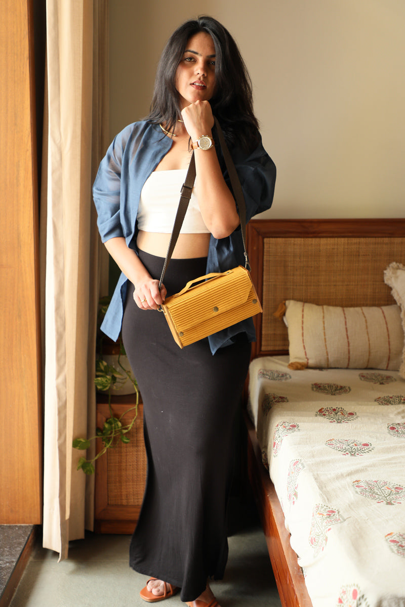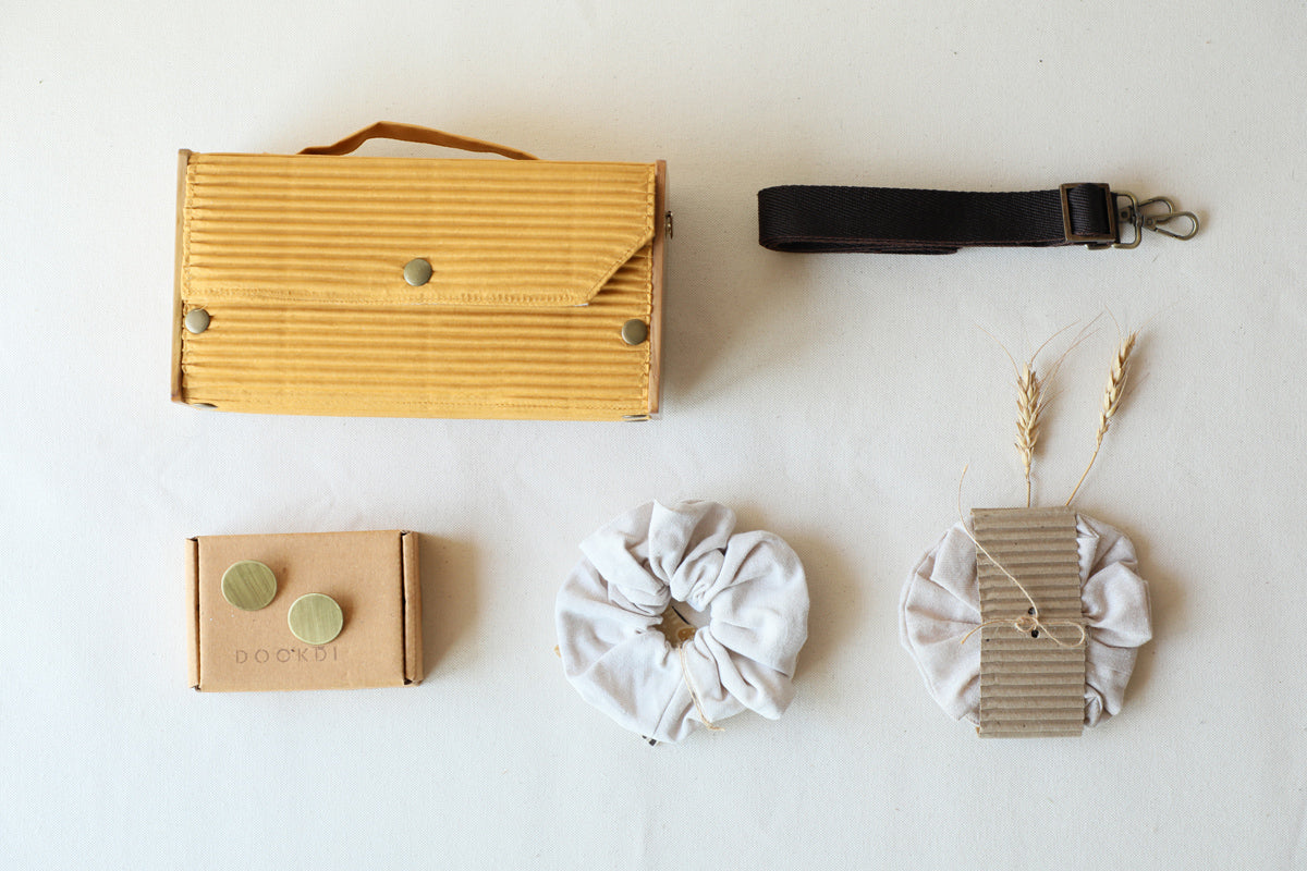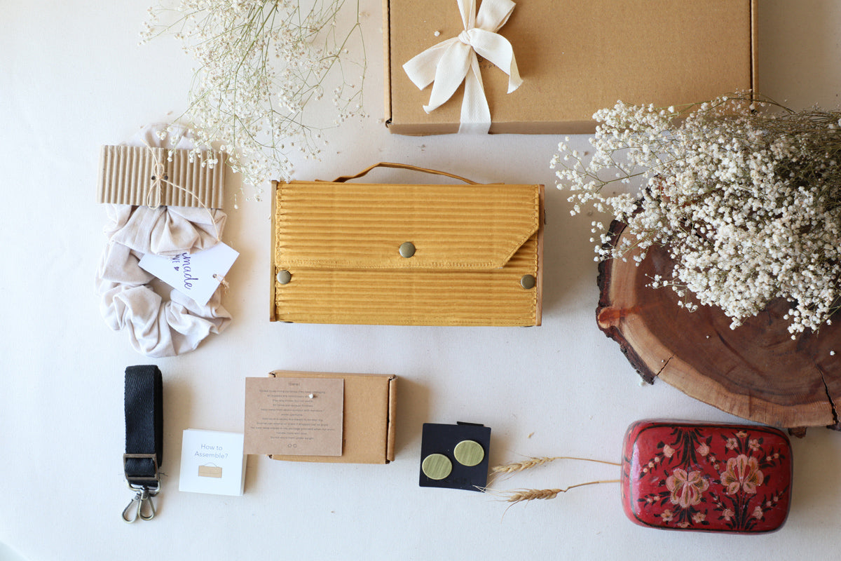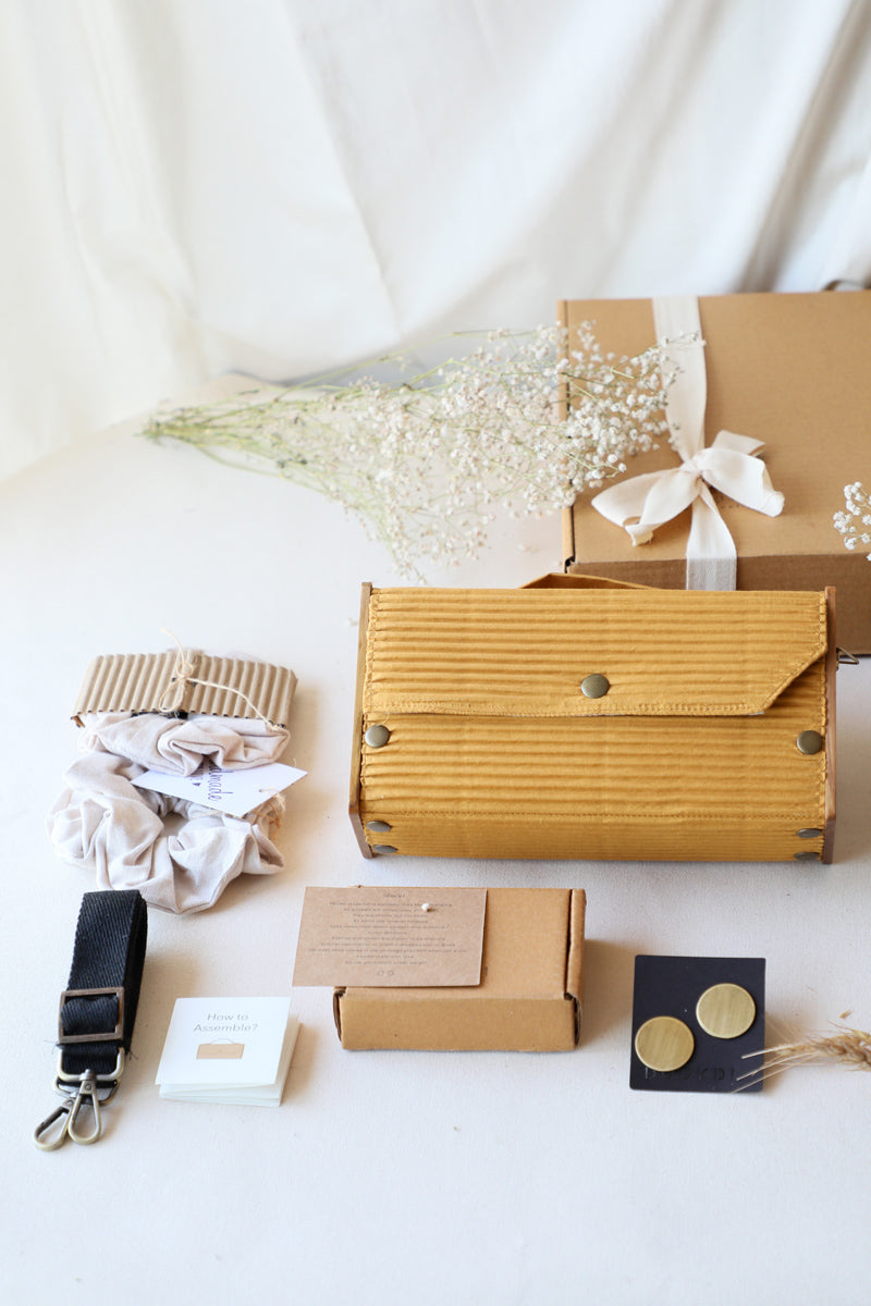 Clutch-Lukka Chuppi: Made from upcycled fabric, Re-claimed wood, Corrugated paper.