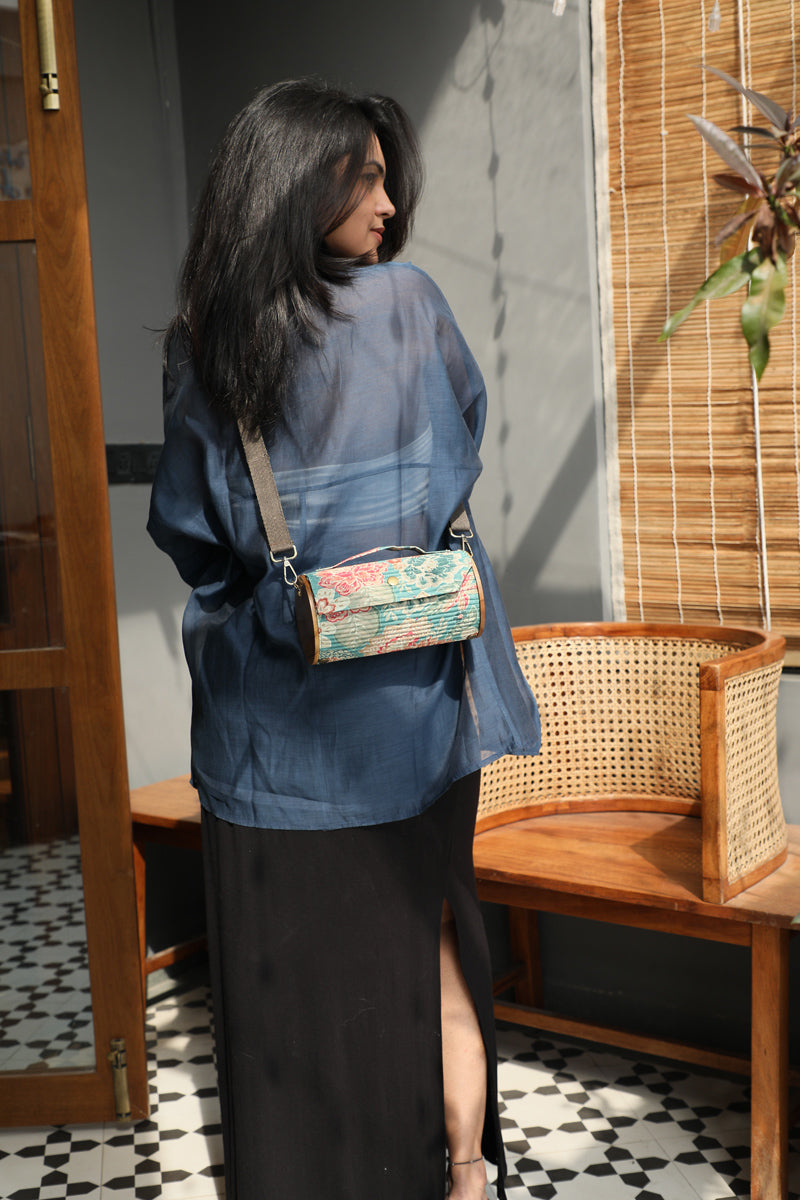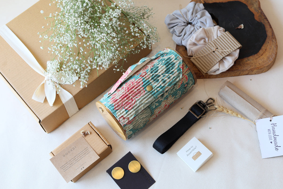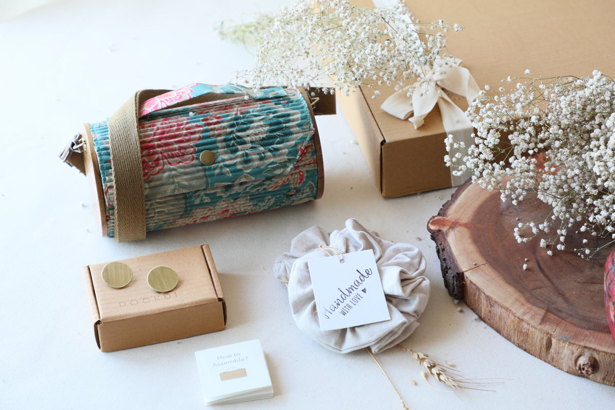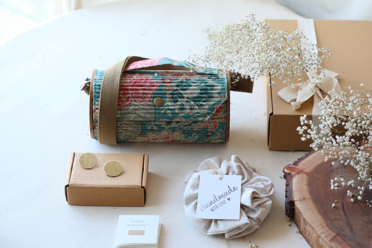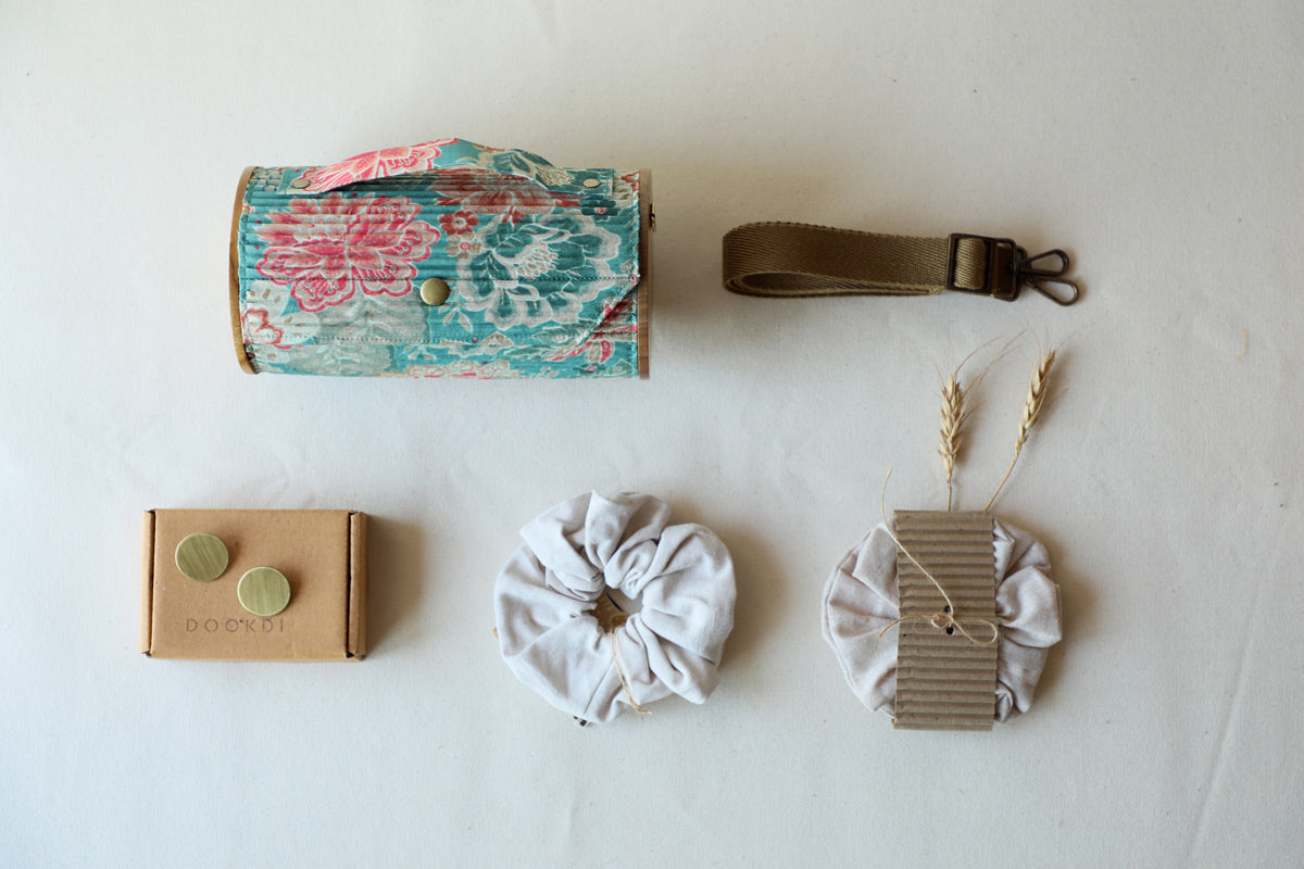Clutch-Lukka Chuppi: Made from upcycled fabric, Re-claimed wood, Corrugated paper.