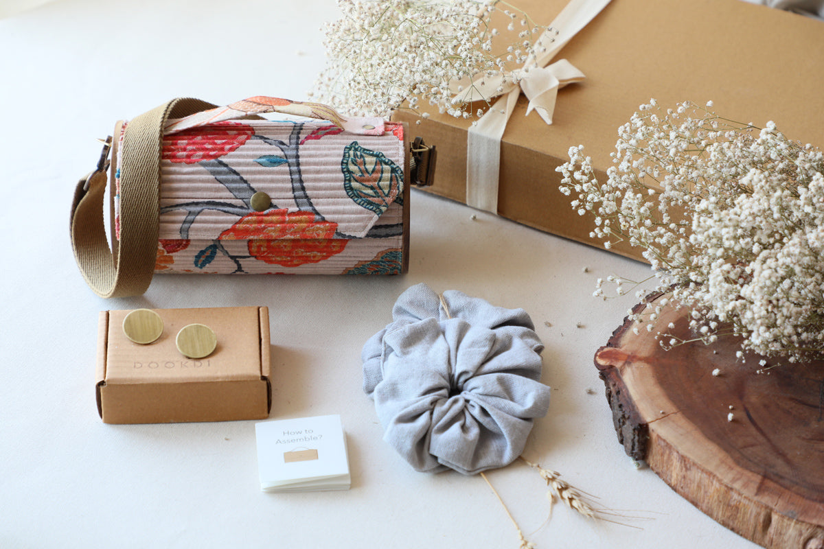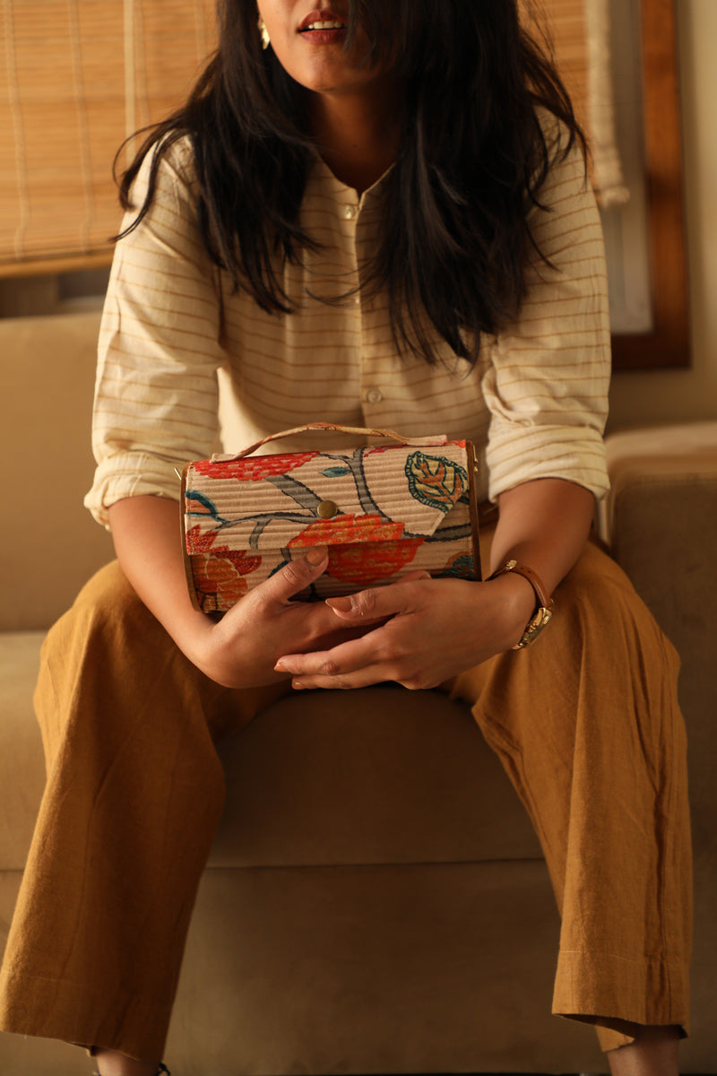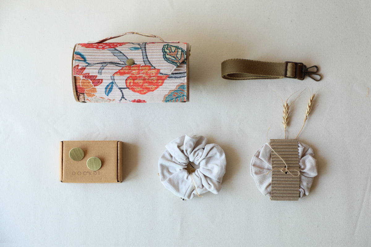 Clutch-Lukka Chuppi: Made from upcycled fabric, Re-claimed wood, Corrugated paper.