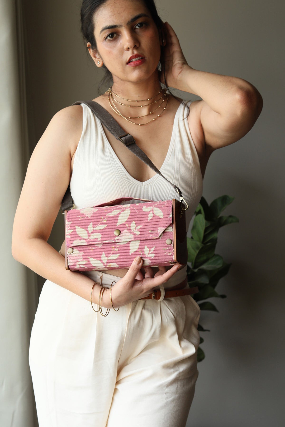 Sustainability: If we used virgin fabric and dyes our carbon footprint and water usage would be off the charts. Instead, our circular production uses upcycled Fabrics sourced directly from Block printer, and post production waste by local Tailors and Designers.. Lukka Chuppi box clutch – a cleverly designed accessory that effortlessly offers two distinct looks in one. With one set of wood and two sleeves, you can switch styles on the fly. This two-in-one bag includes two sleeves, a pair of wood accents, and a sleek sling belt for added convenience. Crafted with eco-conscious materials like upcycled fabric and reclaimed wood, it's both collapsible and interchangeable, making it perfect for the eco-minded shopper. Packed in zero-waste packaging, it's a smart choice for sustainable style.