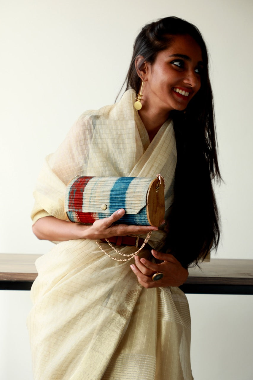 Sustainability: If we used virgin fabric and dyes our carbon footprint and water usage would be off the charts. Instead, our circular production uses upcycled Fabrics sourced directly from Block printer, and post production waste by local Tailors and Designers.. The classic mini-clutch now comes in three distinct shapes, crafted entirely from upcycled silk. Perfectly designed for those who value simplicity, this rigid mini-clutch is not only vegan but also eco-friendly, made from materials like upcycled fabric and reclaimed wood. It comes with a sling chain and is ideal for storing essentials such as your phone, mini cardholder, car keys, and basic makeup