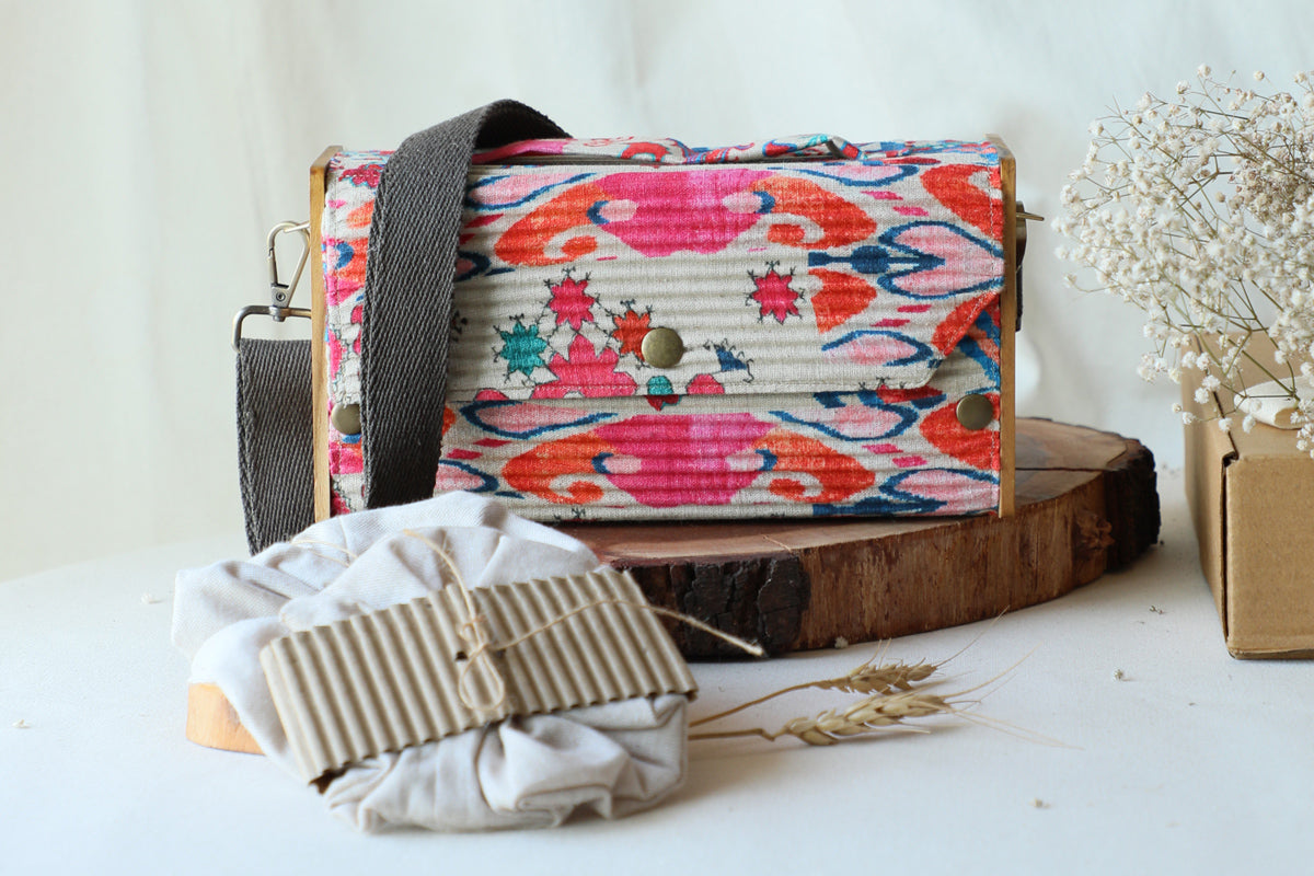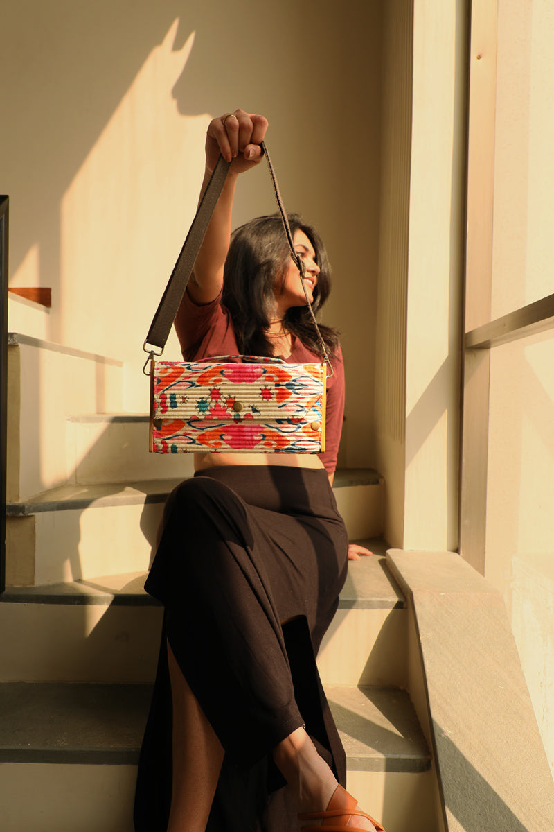Clutch-Lukka Chuppi: Made from upcycled fabric, Re-claimed wood, Corrugated paper.