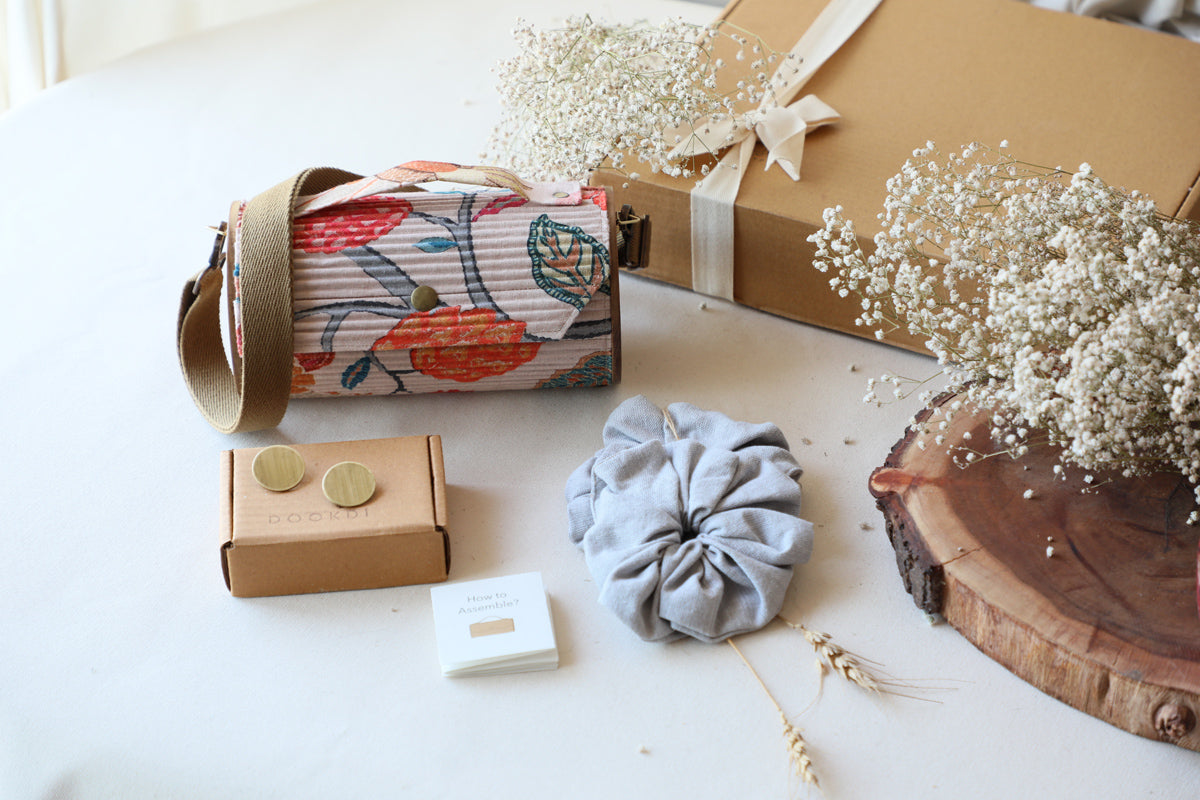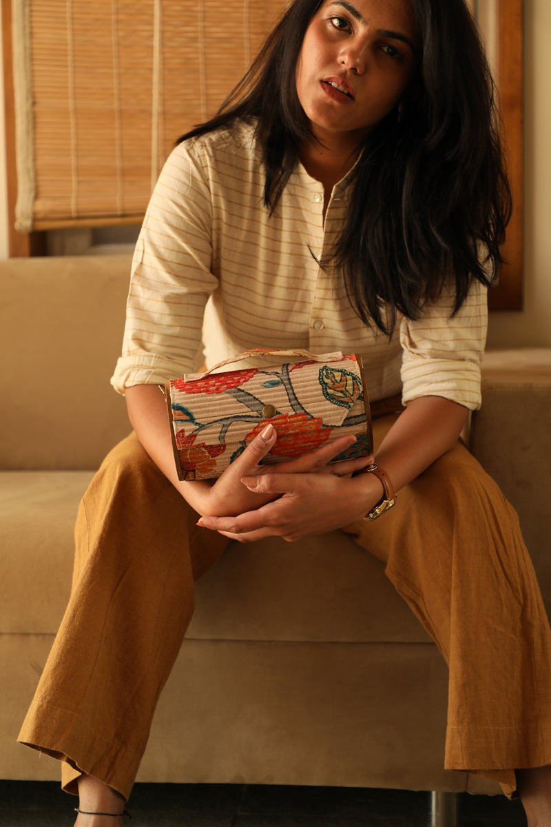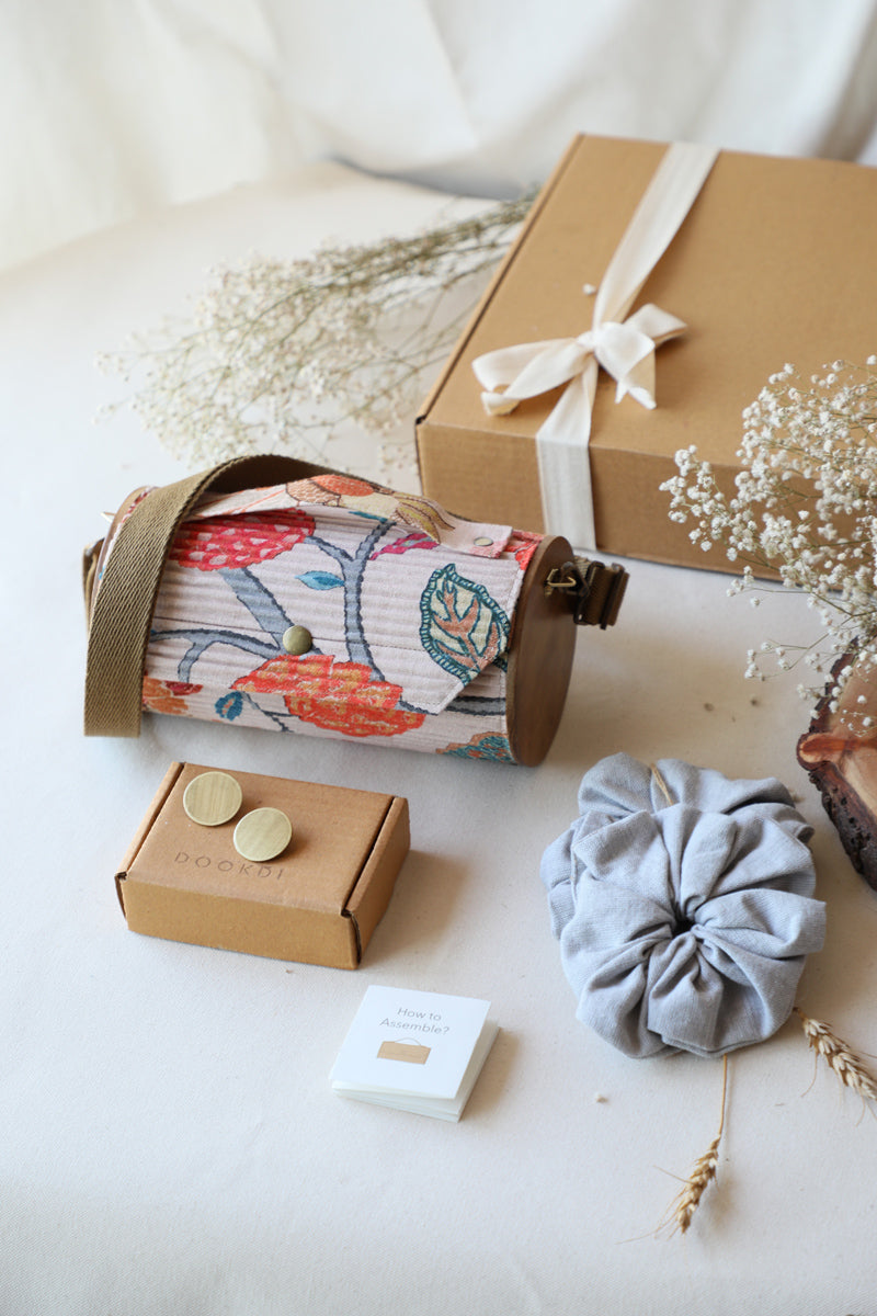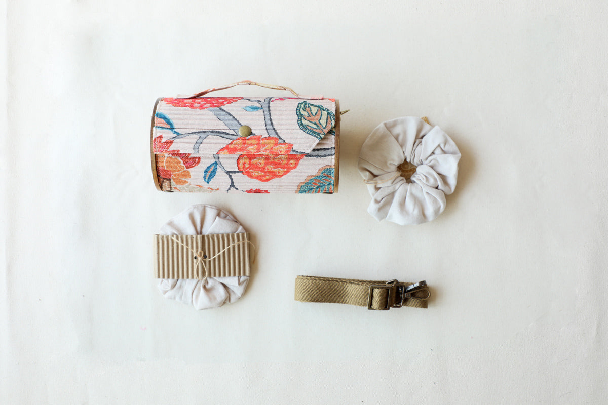 Clutch-Lukka Chuppi: Made from upcycled fabric, Re-claimed wood, Corrugated paper.