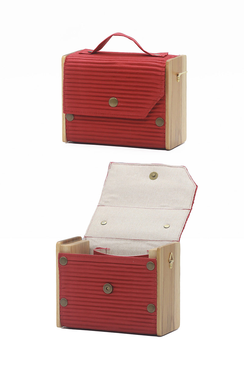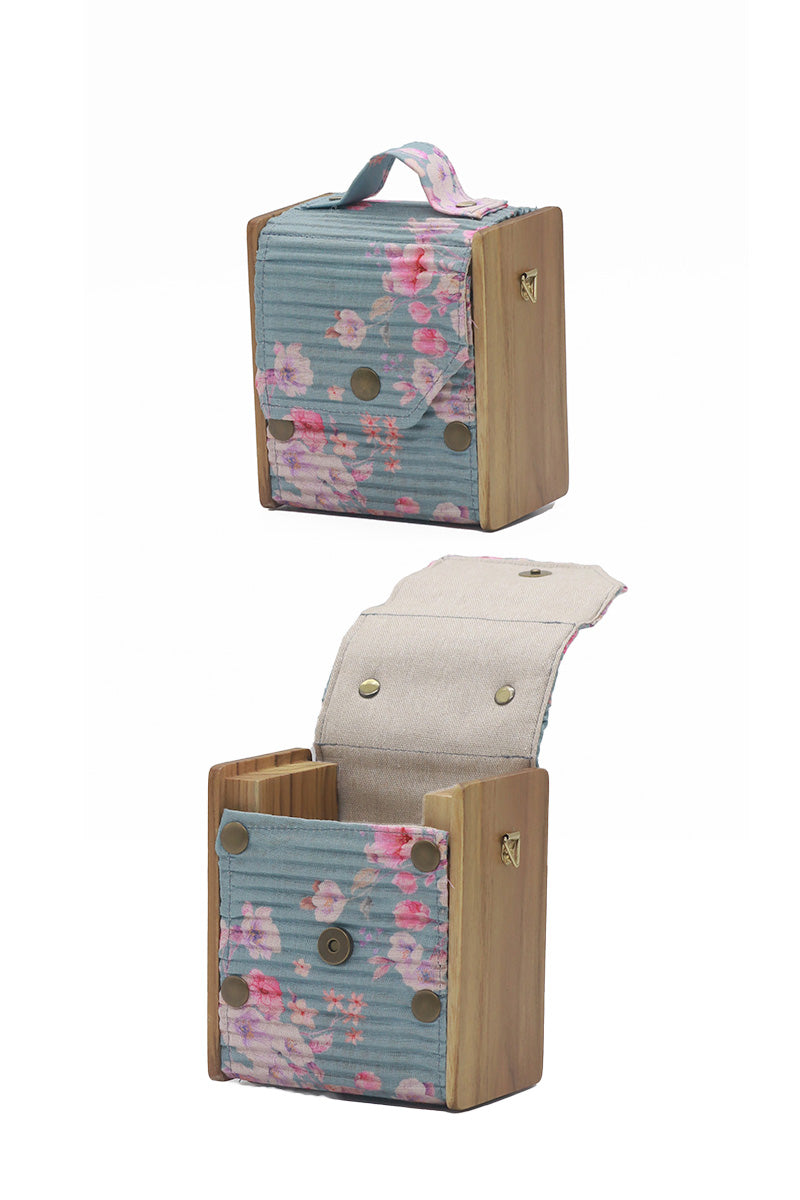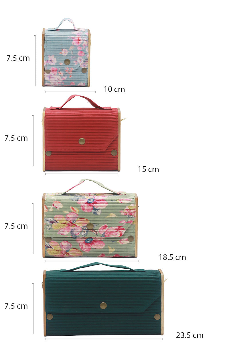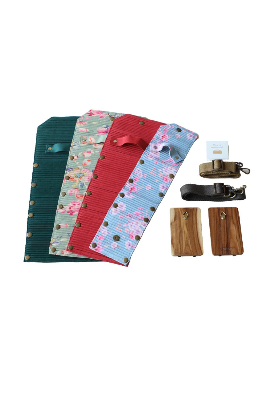 Our 4-in-1 Clutch Box comes with one pair of wood and four sleeves, enabling you to effortlessly create four different sizes with just one set. Complete with two different colored belts for added style, our products are not only collapsible but also interchangeable and entirely foldable. Packaged in zero-waste packaging, they are crafted with eco-friendly materials like upcycled fabric and reclaimed wood.