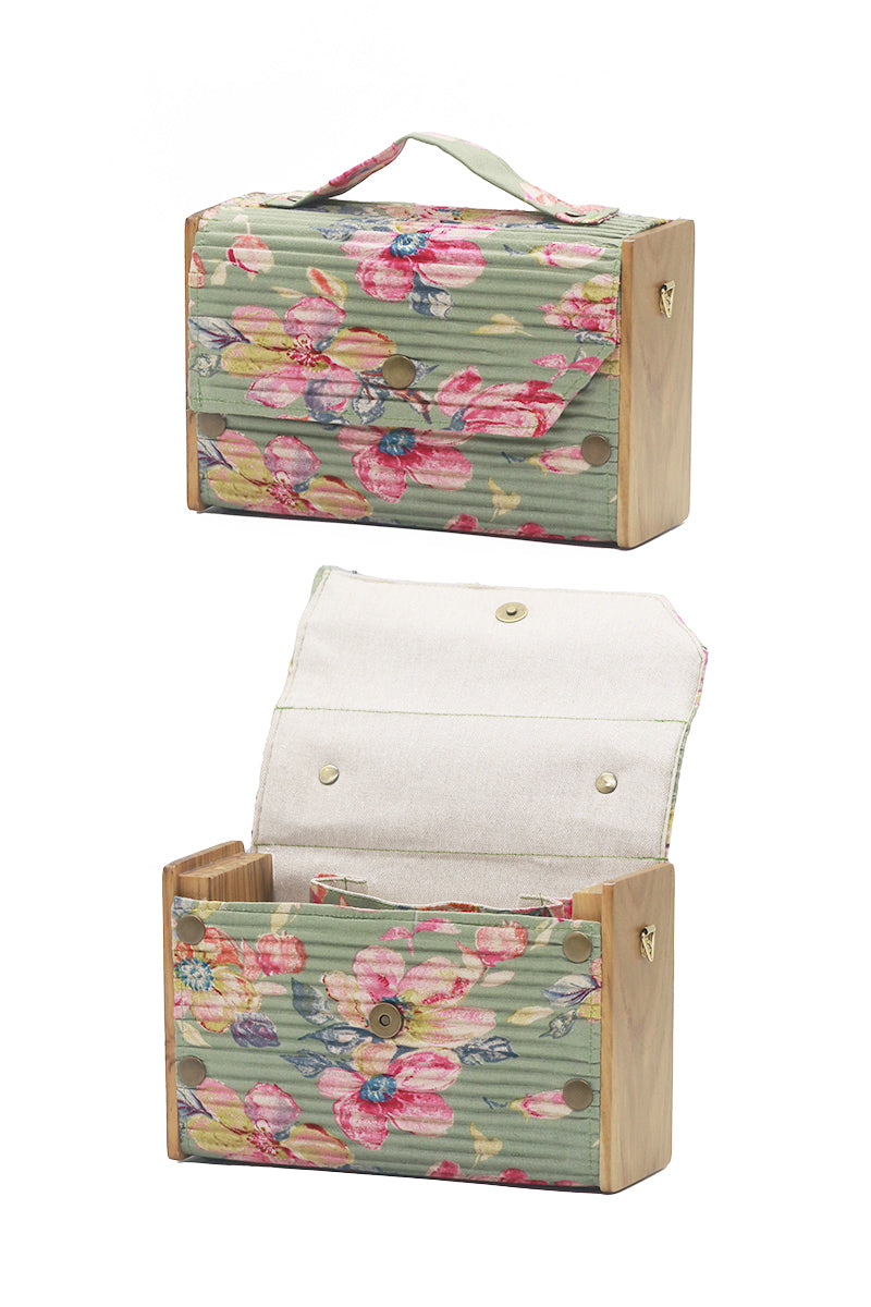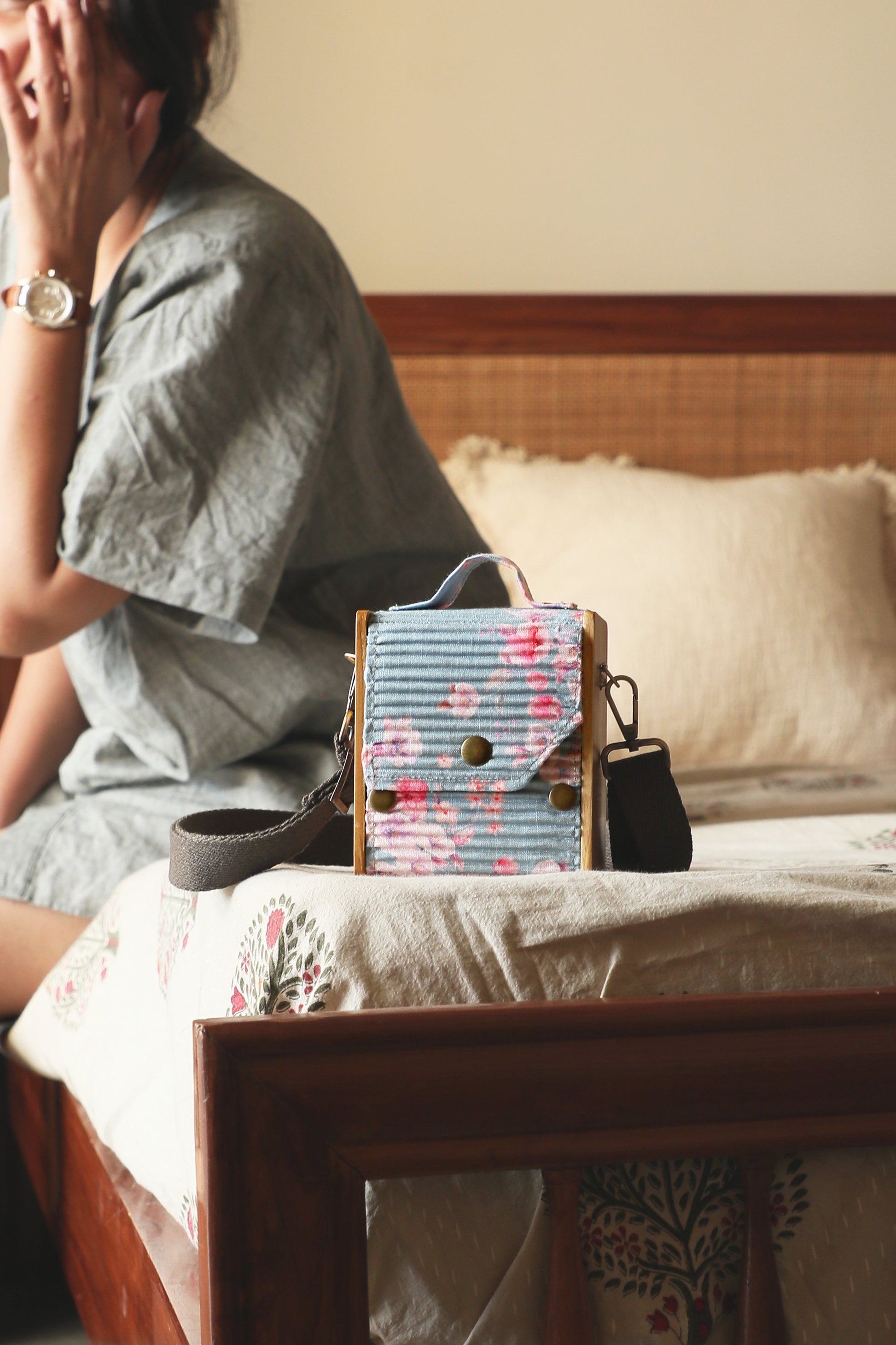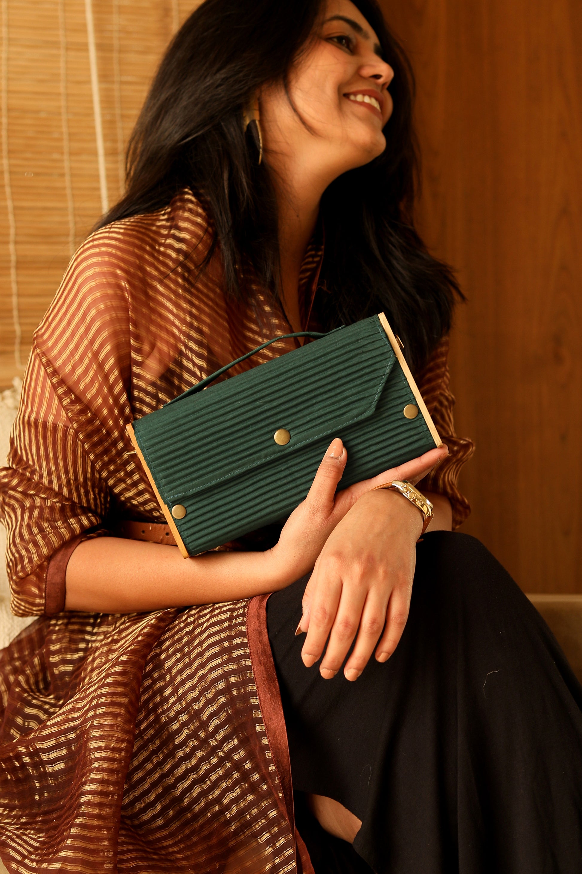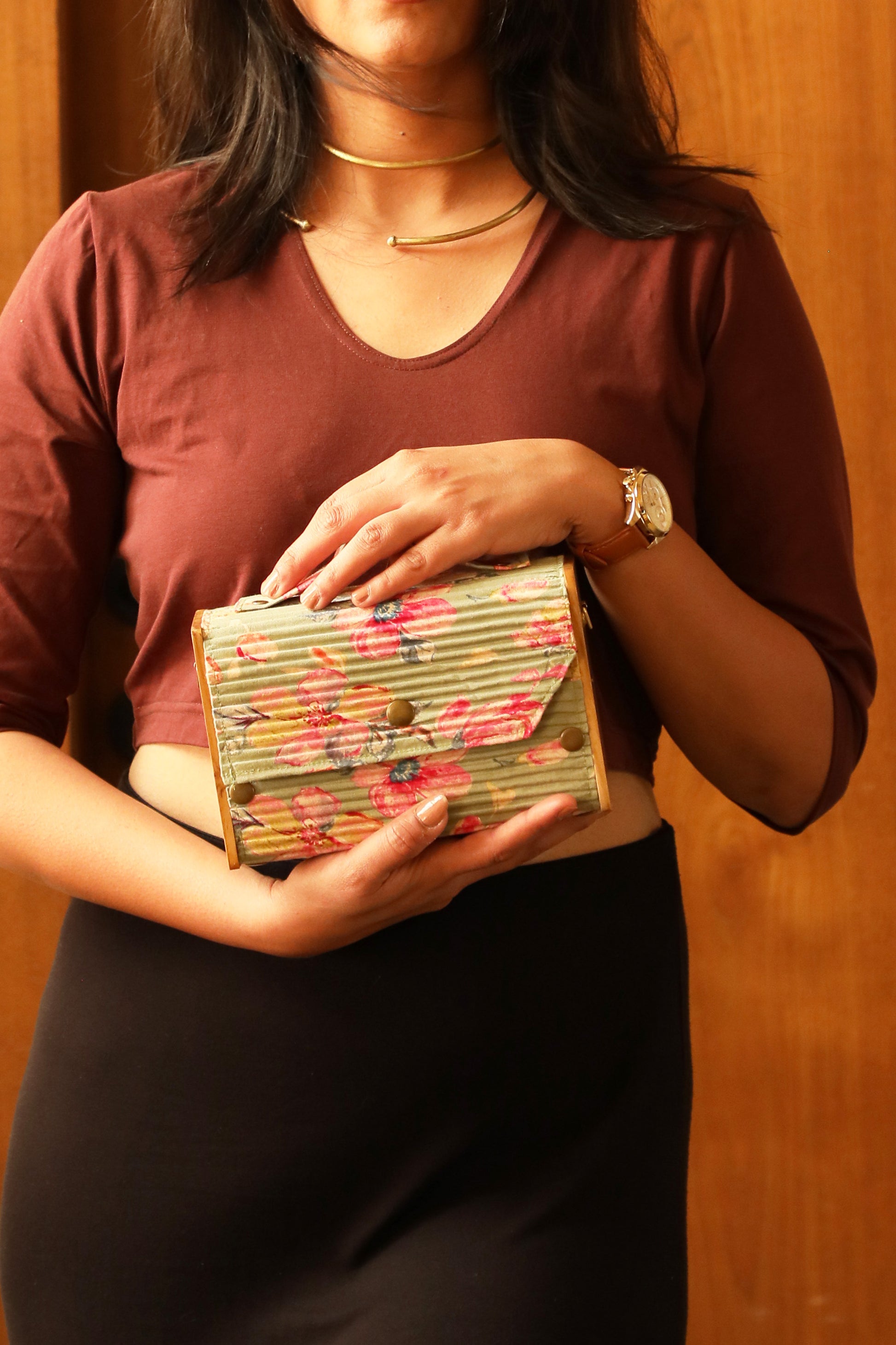 Our 4-in-1 Clutch Box comes with one pair of wood and four sleeves, enabling you to effortlessly create four different sizes with just one set. Complete with two different colored belts for added style, our products are not only collapsible but also interchangeable and entirely foldable. Packaged in zero-waste packaging, they are crafted with eco-friendly materials like upcycled fabric and reclaimed wood.
