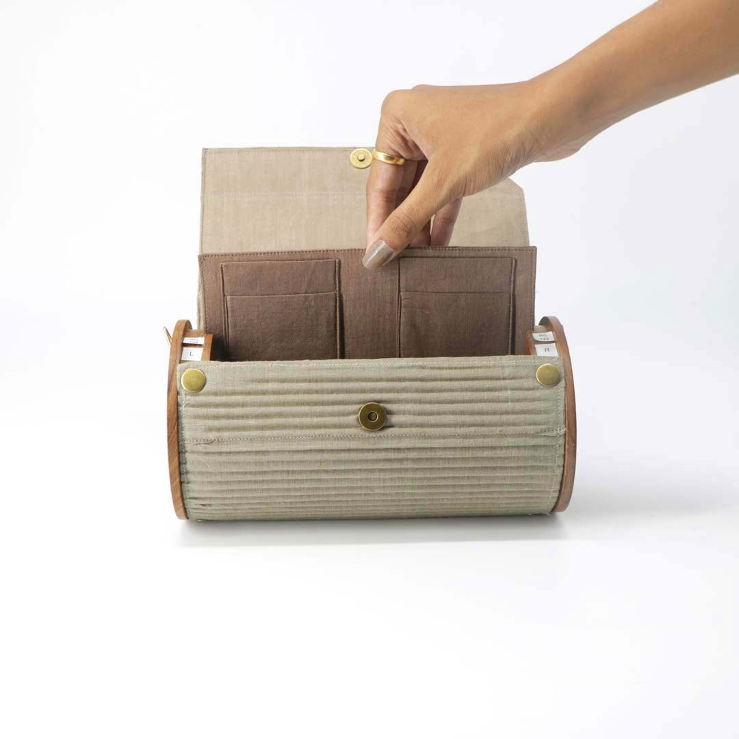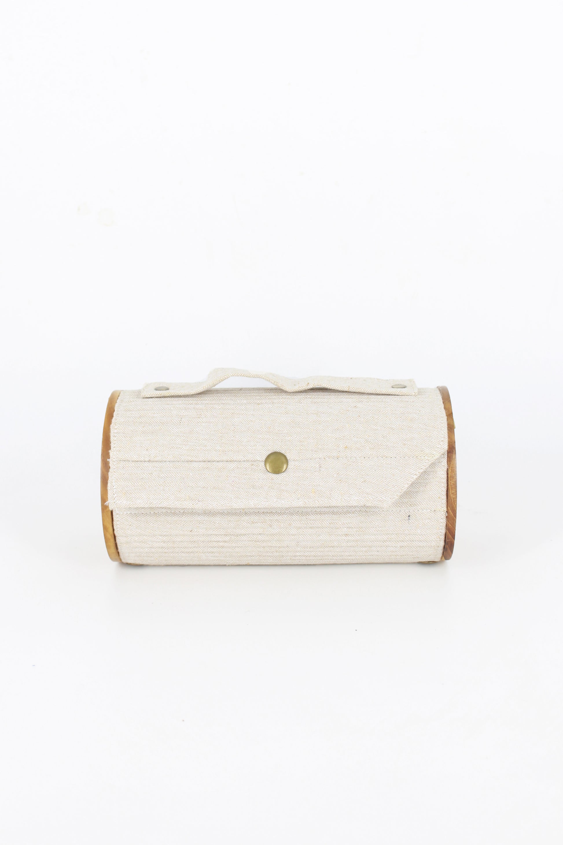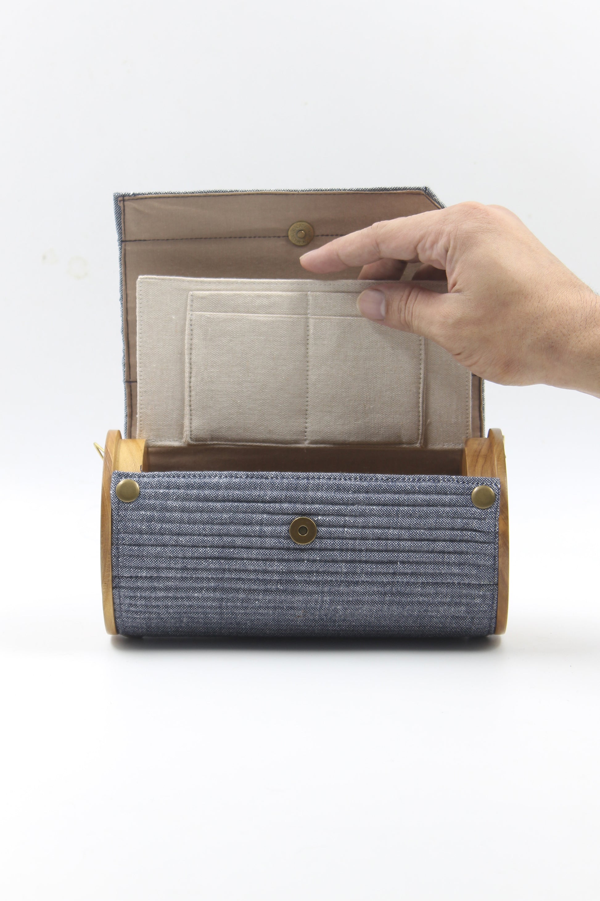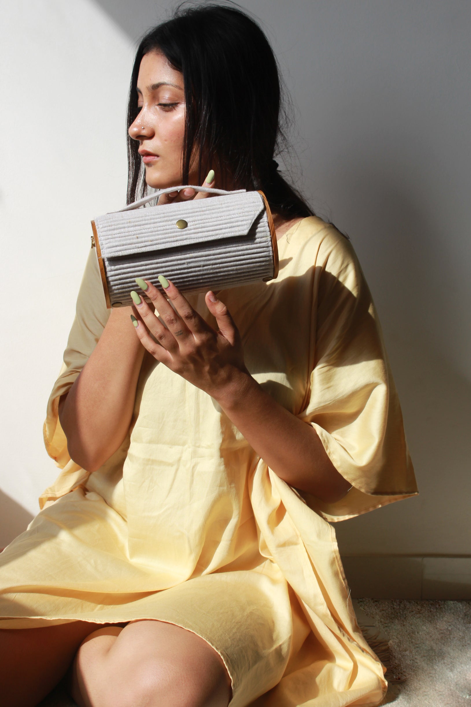 The Lukka Chuppi Box Clutch Embodies The Perfect Blend Of Elegance, And Sustainability While Showcasing An Irresistibly Minimalistic Style. We Believe In The Power Of Up-Cycling And Hand-Craftsmanship To Create Beautiful, Sustainable Bags That Not Only Make A Fashion Statement But Also Contribute To A Better Planet.Our 4-in-1 Round Clutch includes one pair of wood and four sleeves, allowing you to effortlessly create four different clutches, each in a unique size, one at a time. It also comes with two differently colored belts for added style. Our products are not only collapsible but also interchangeable and entirely foldable. Packaged in zero-waste packaging, they are crafted with eco-friendly materials such as upcycled fabric and reclaimed wood.