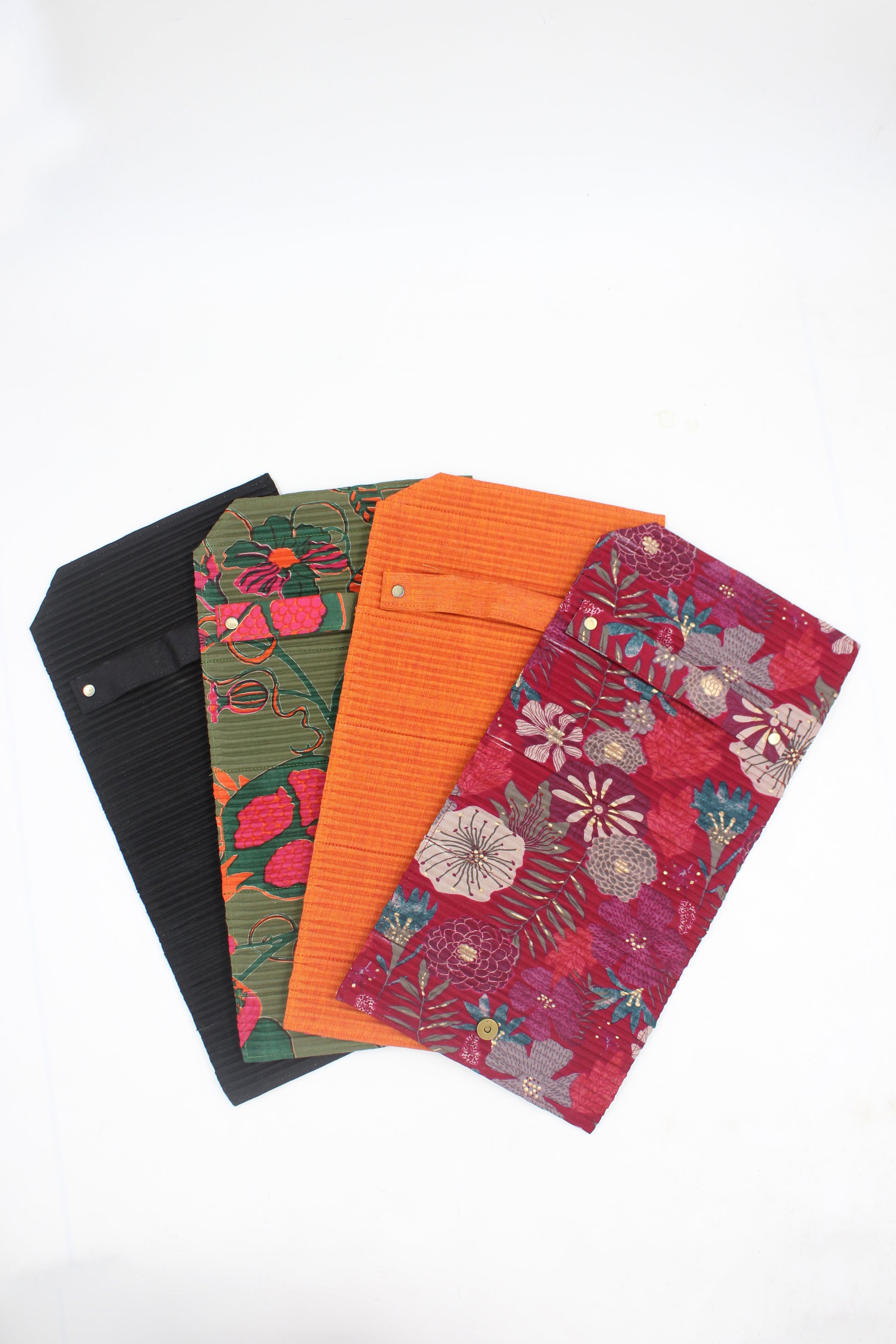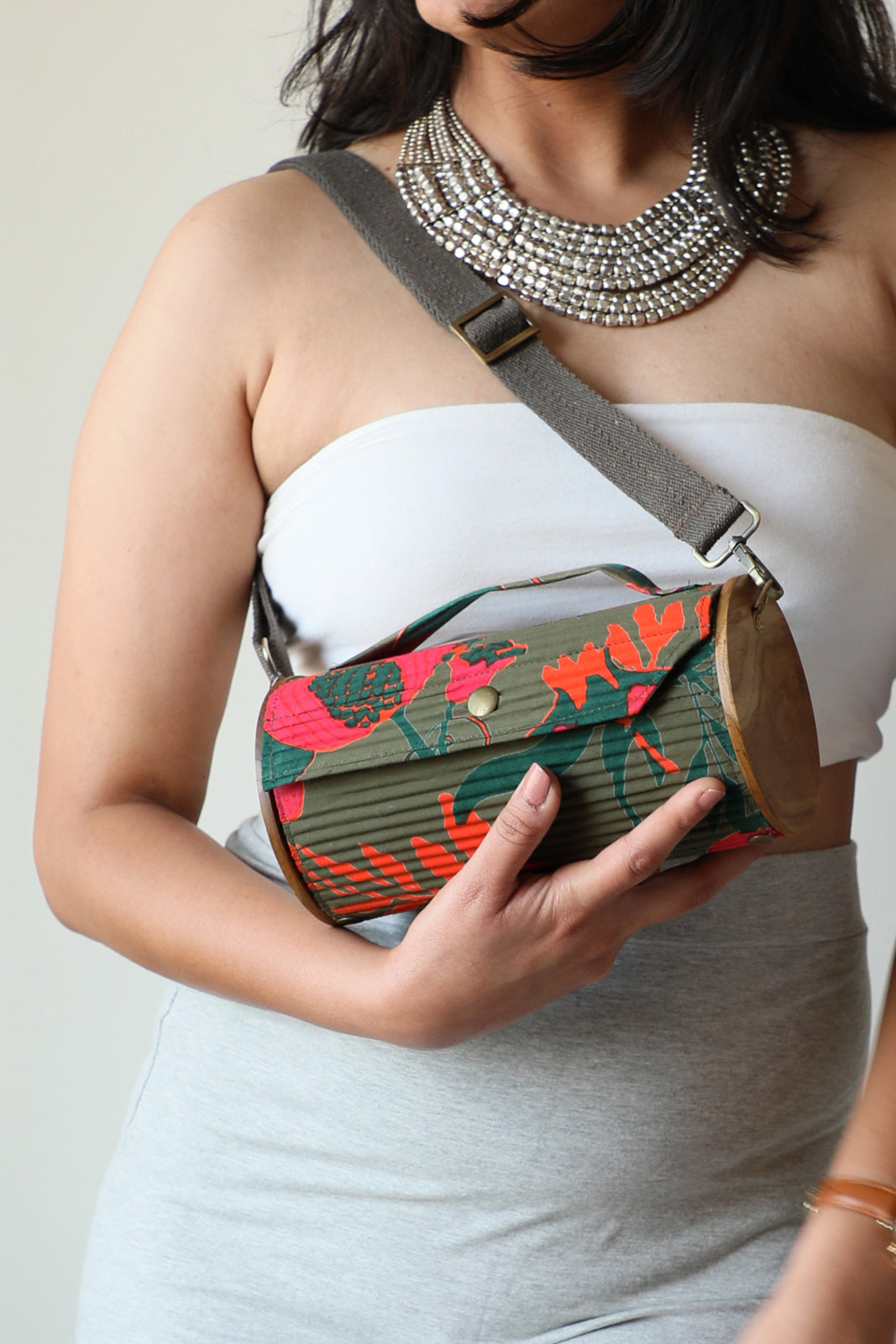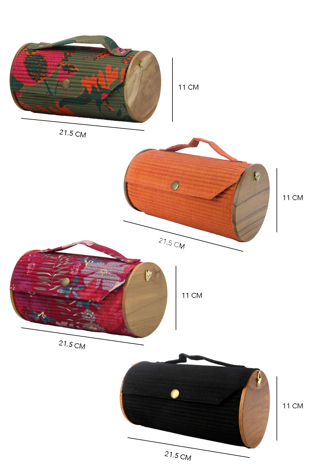 Our 4-in-1 Clutch Box comes with one pair of wood and four sleeves, enabling you to effortlessly create four different sizes with just one set. Complete with two different colored belts for added style, our products are not only collapsible but also interchangeable and entirely foldable. Packaged in zero-waste packaging, they are crafted with eco-friendly materials like upcycled fabric and reclaimed wood.