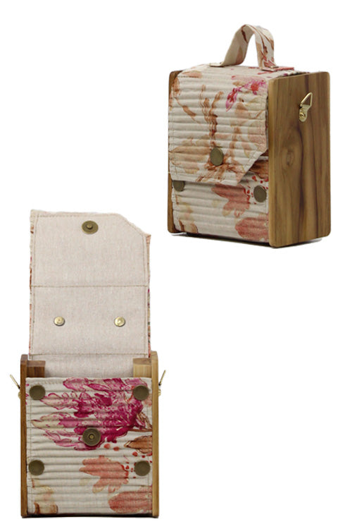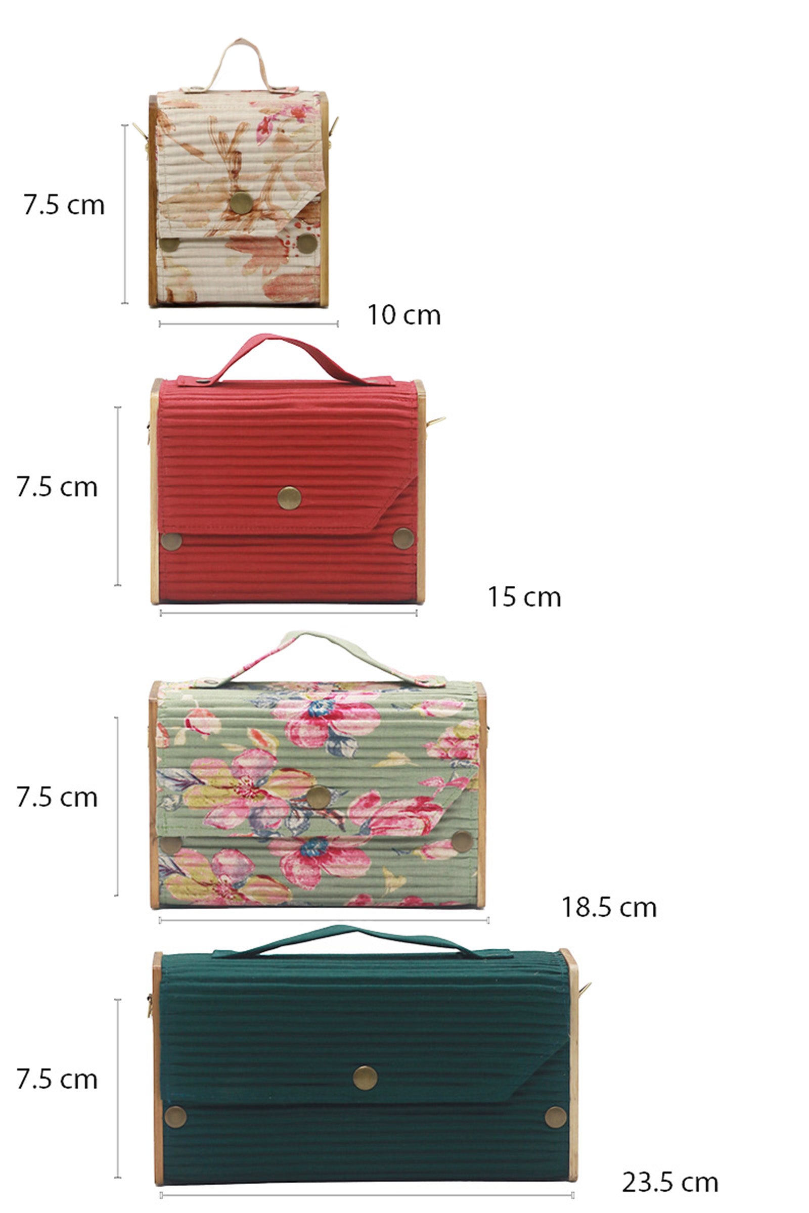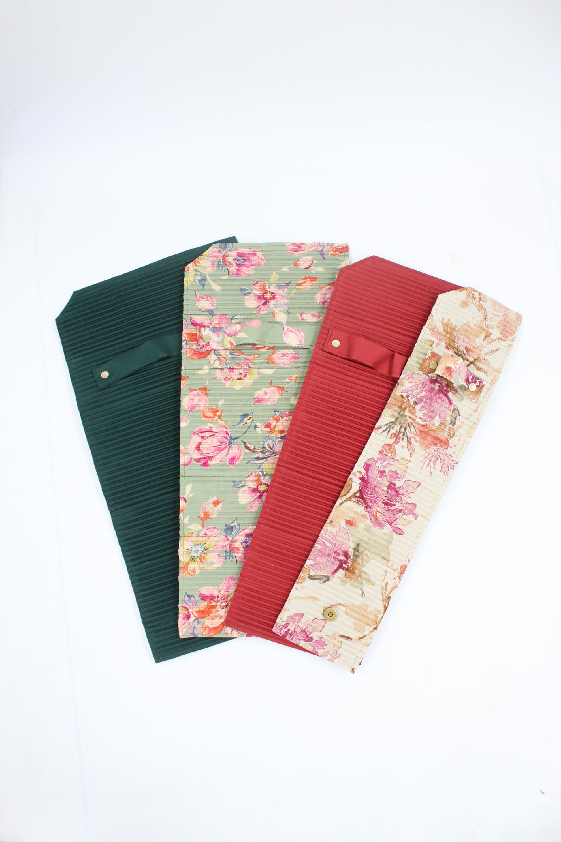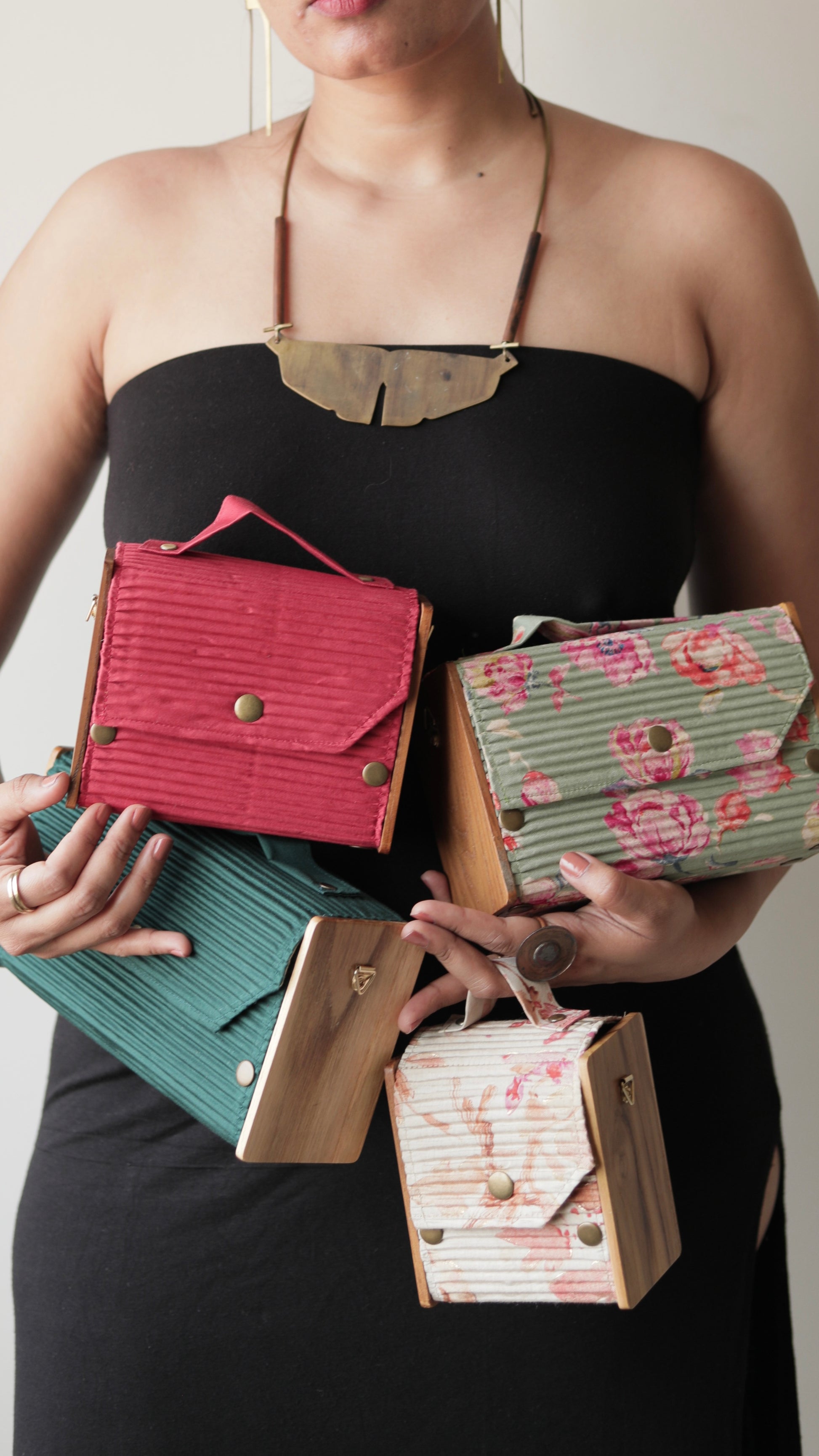 Our 4-in-1 Clutch Box comes with one pair of wood and four sleeves, enabling you to effortlessly create four different sizes with just one set. Complete with two different colored belts for added style, our products are not only collapsible but also interchangeable and entirely foldable. Packaged in zero-waste packaging, they are crafted with eco-friendly materials like upcycled fabric and reclaimed wood.