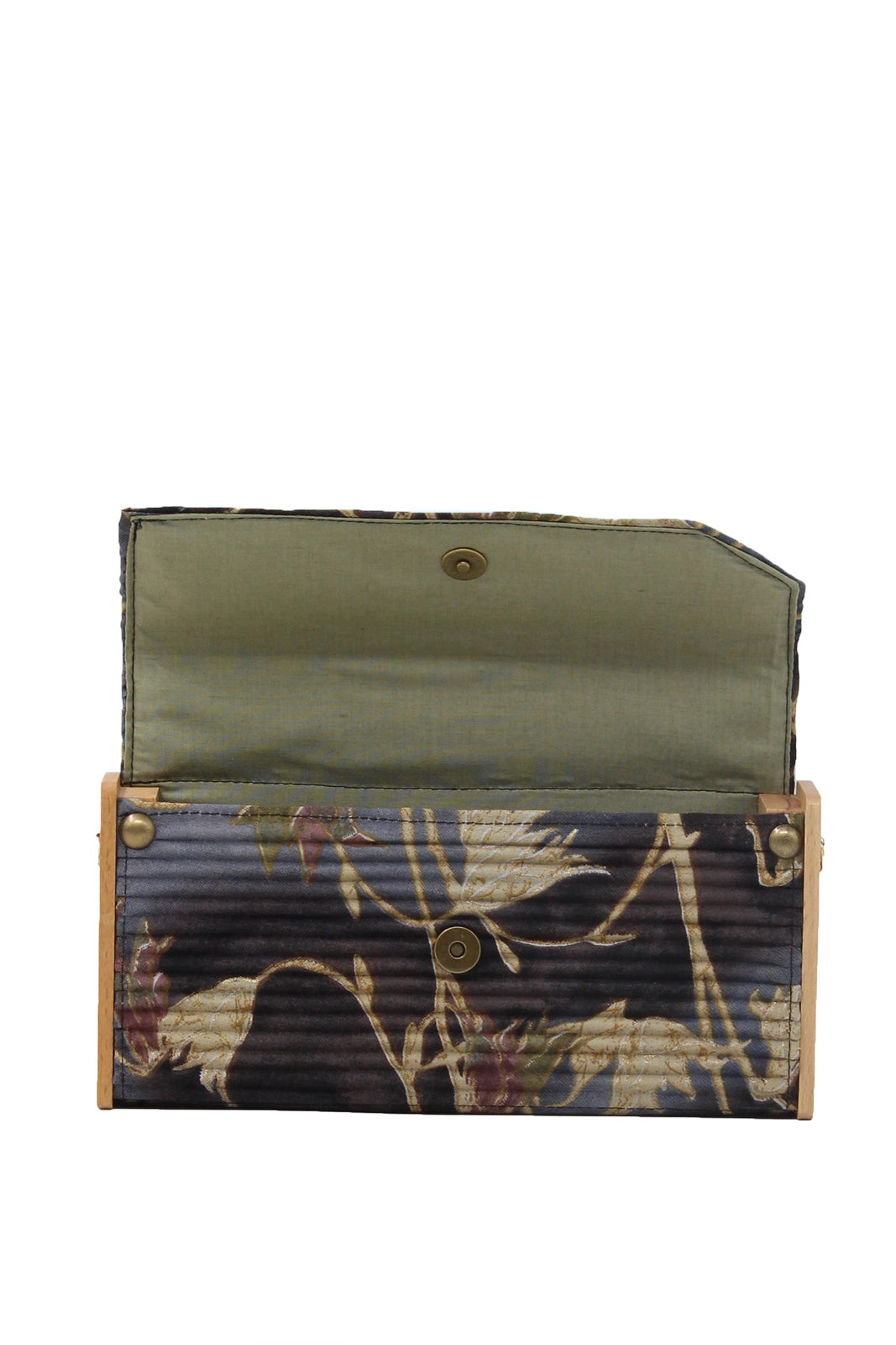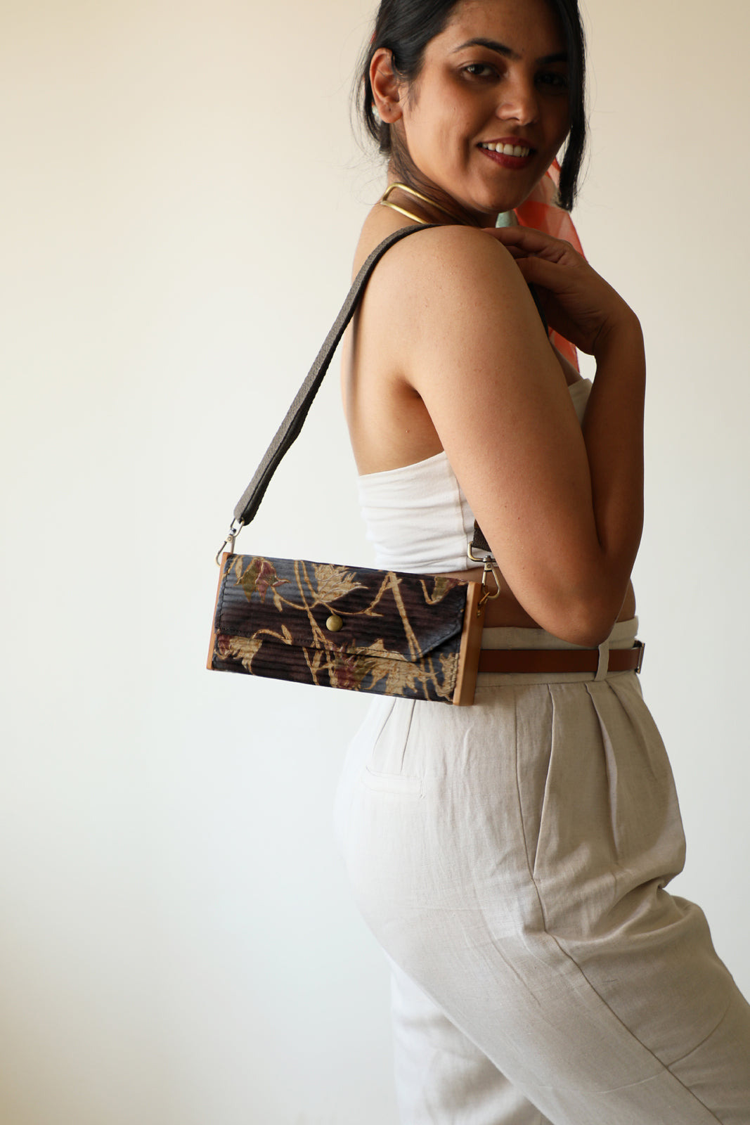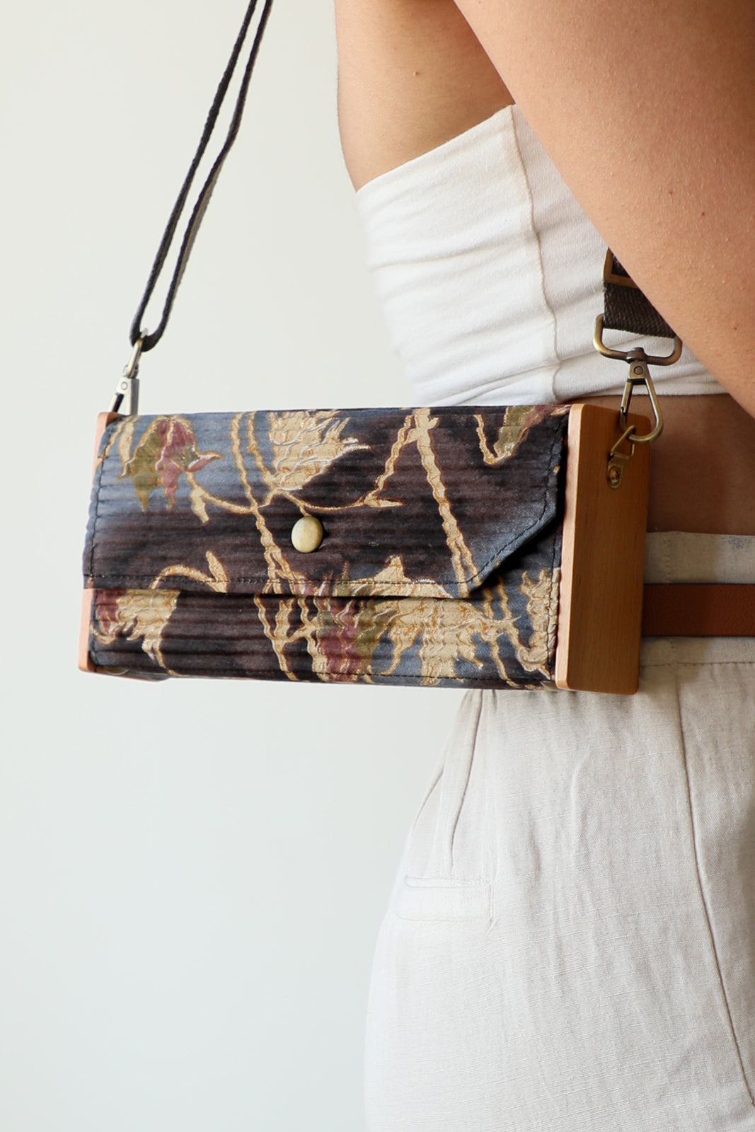 Lukka Chuppi Mini Clutch – made for those who value simplicity. This rigid mini clutch is crafted entirely from eco-friendly materials like upcycled fabric and reclaimed wood. Comes with a sleek belt, it's ideal for storing essentials such as your phone, mini card holder, car keys and basic makeup items.